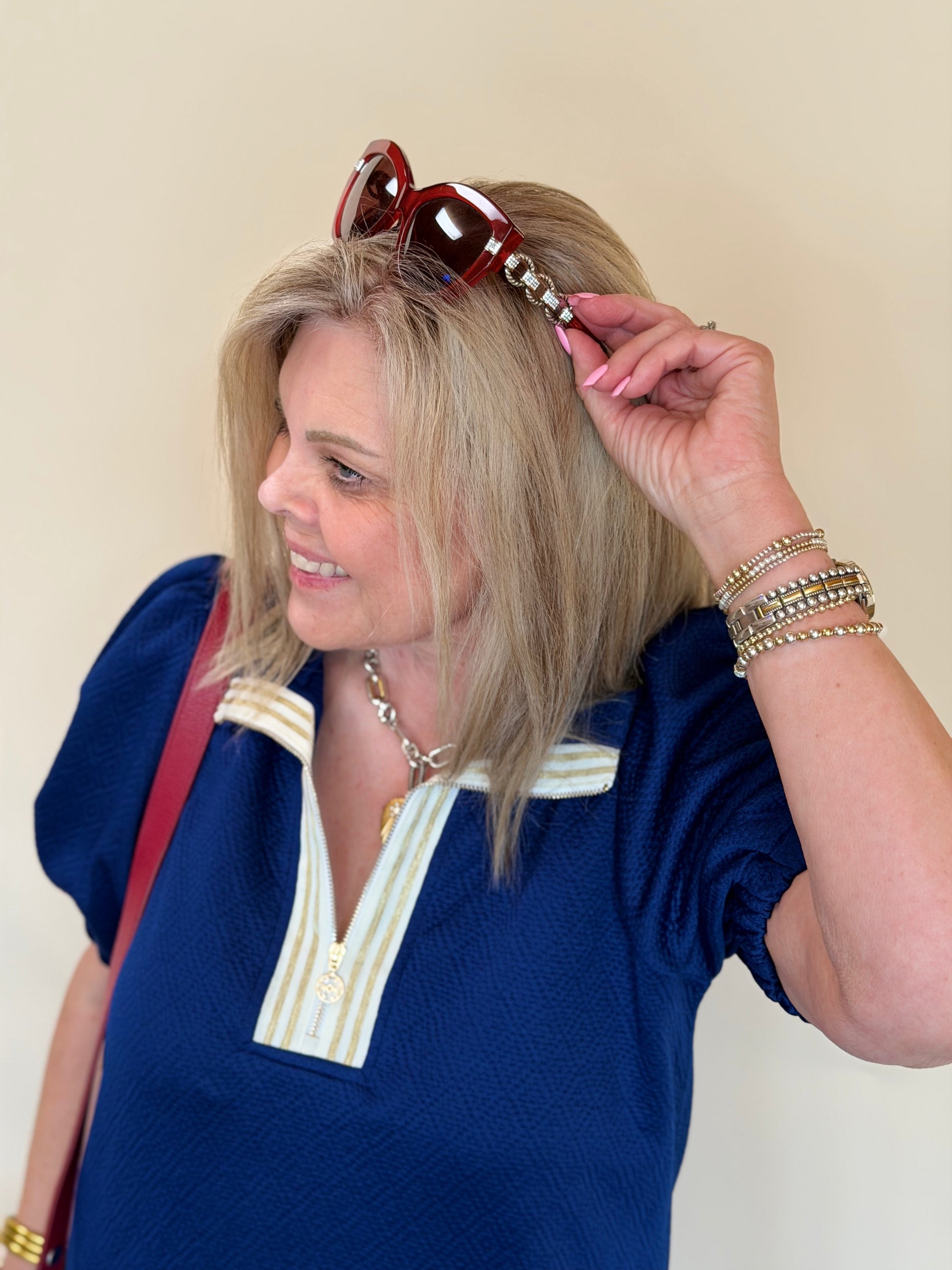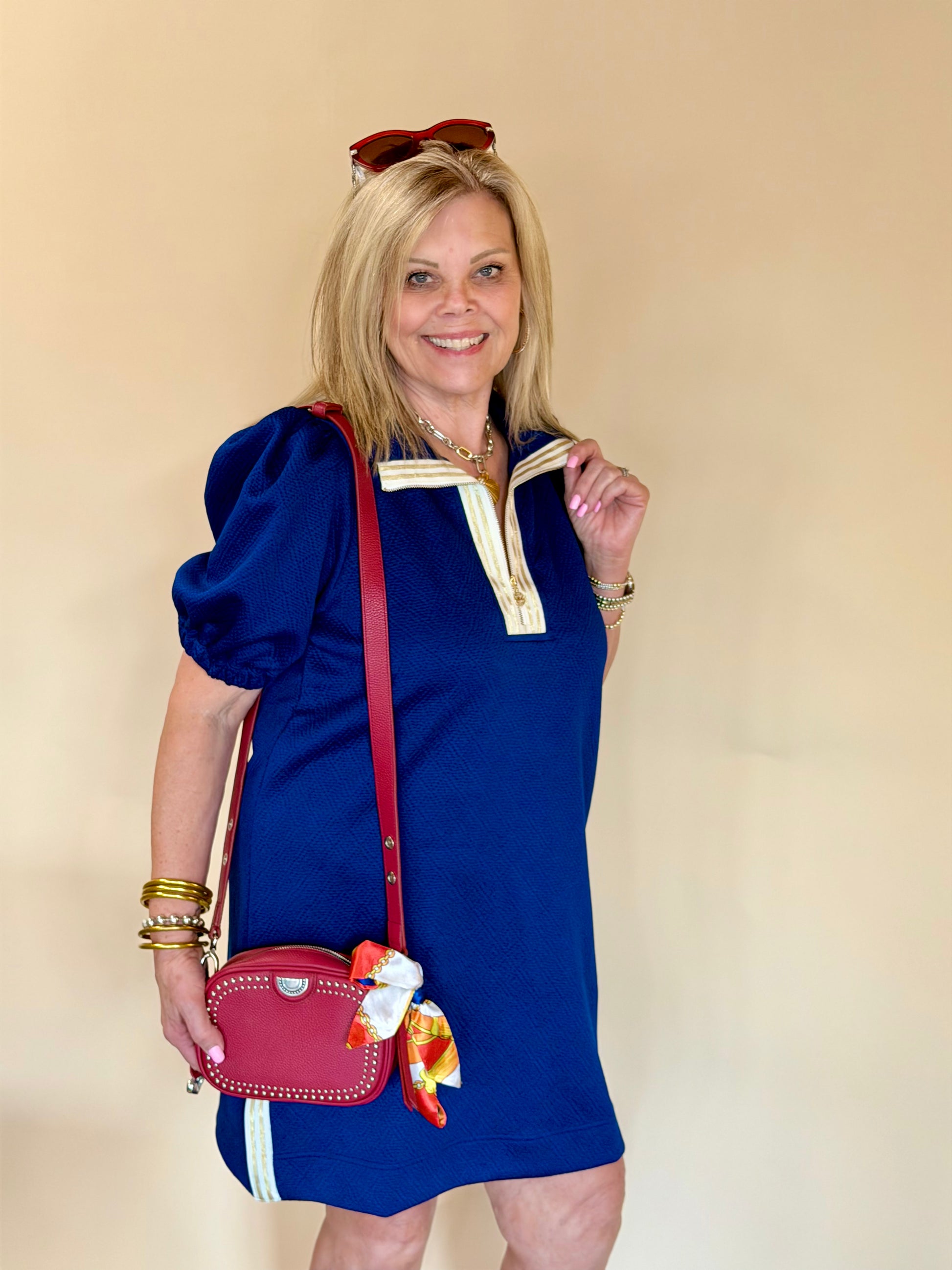 Introducing the Andie Dress - made from our exclusive new crosshatch jacquard fabric. This dress features elegant puff sleeves with an elastic finish, adding a refined touch. The pop-collar and stripe trim ribbon detail at the placket offer a distinctive flair, while side slits ensure effortless movement.