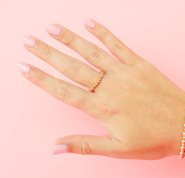 Our dainty gold filled Beaded Bands™ are an elastic ring perfect to wear alone or to be stacked with your class ring or other statement rings. We suggest getting the same size as your ring.