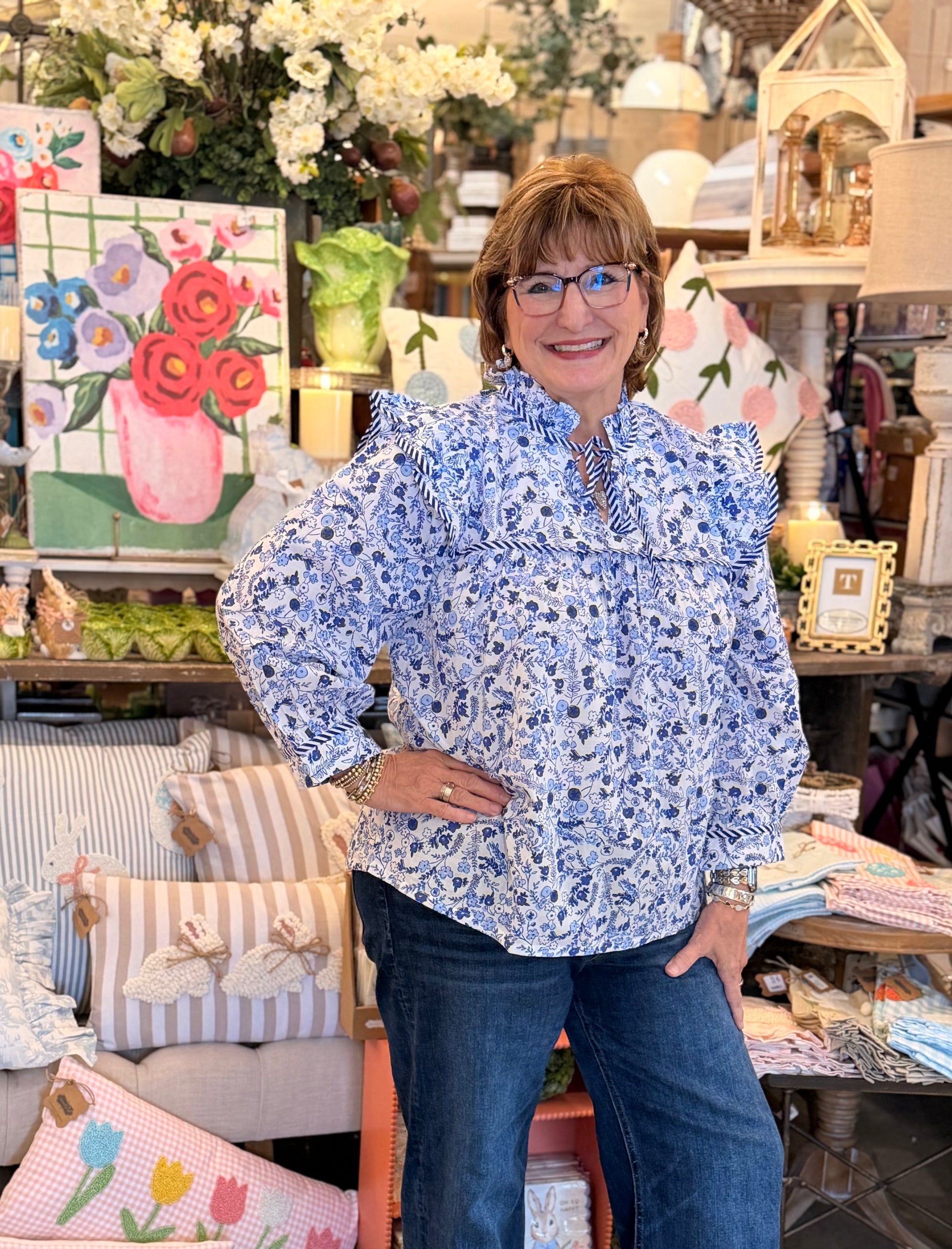 The Beauty Blue Floral Top is a stylish and versatile addition to any wardrobe. The V-neck design is accentuated with elegant ties, adding a touch of sophistication to your look. Ruffle shoulders bring a playful and feminine flair, while the contrast stripe trim provides a chic and modern edge.