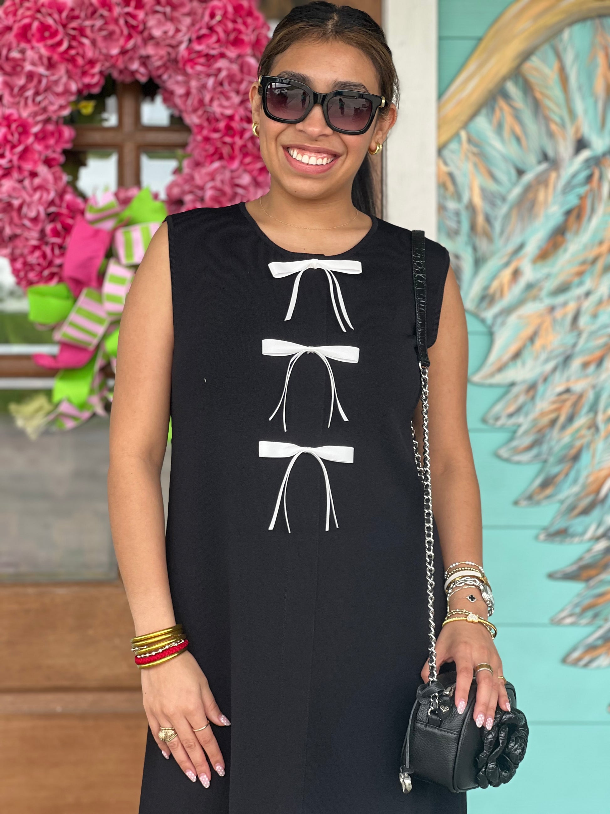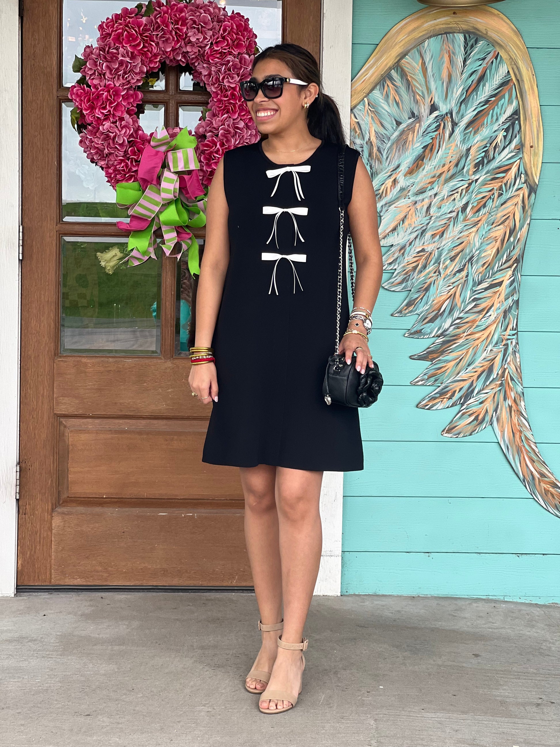 The perfect little black dress with a fashion forward bow detail. Perfect with heels or a denim jacket and sneakers.