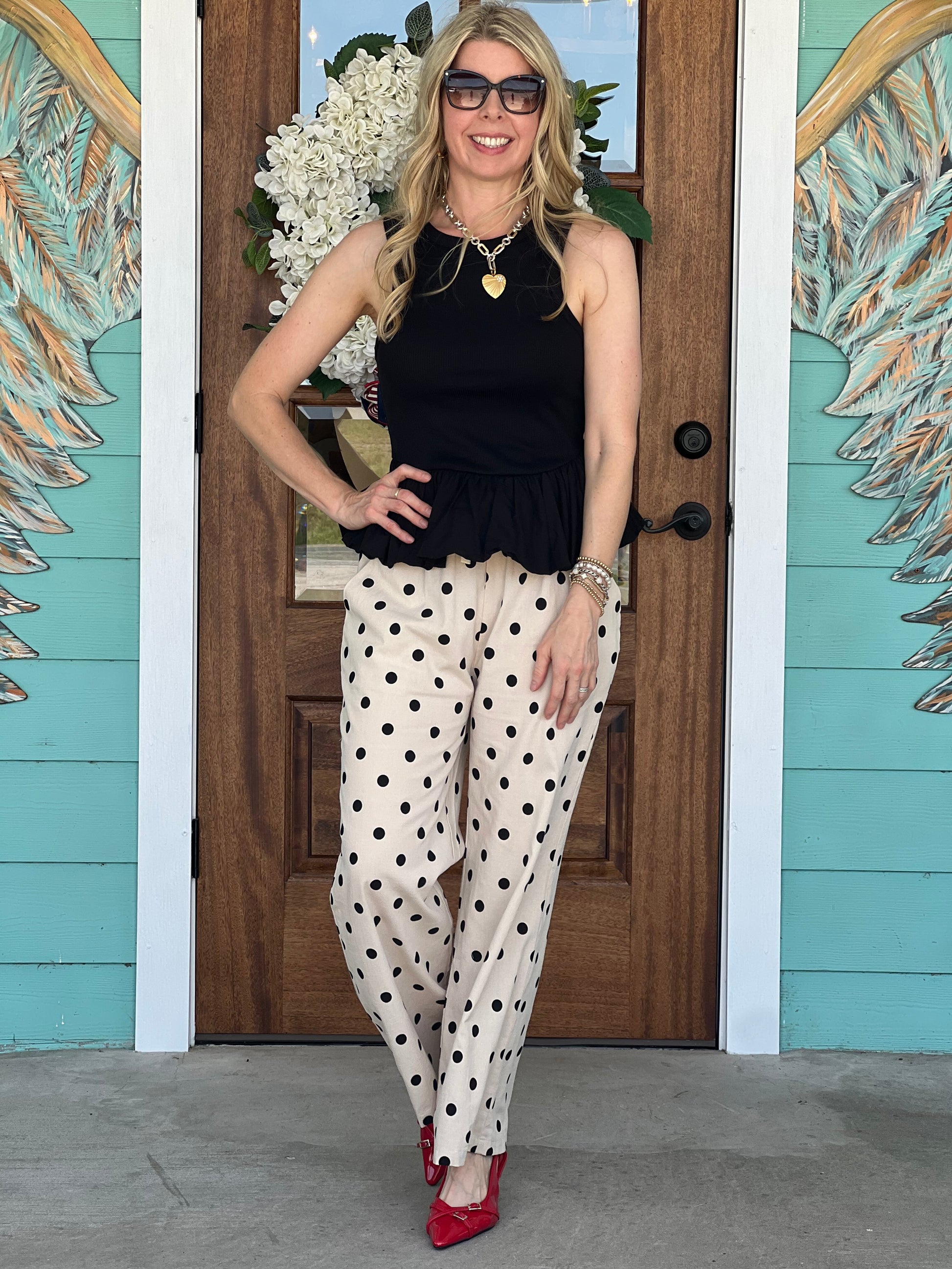 Elevate your wardrobe with our Black Knit & Poplin Peplum Top. This sleeveless top features a flattering round neckline and a delicate knit fabric, perfect for any occasion. The peplum design adds a touch of elegance to your look. Upgrade your style with this must-have top!