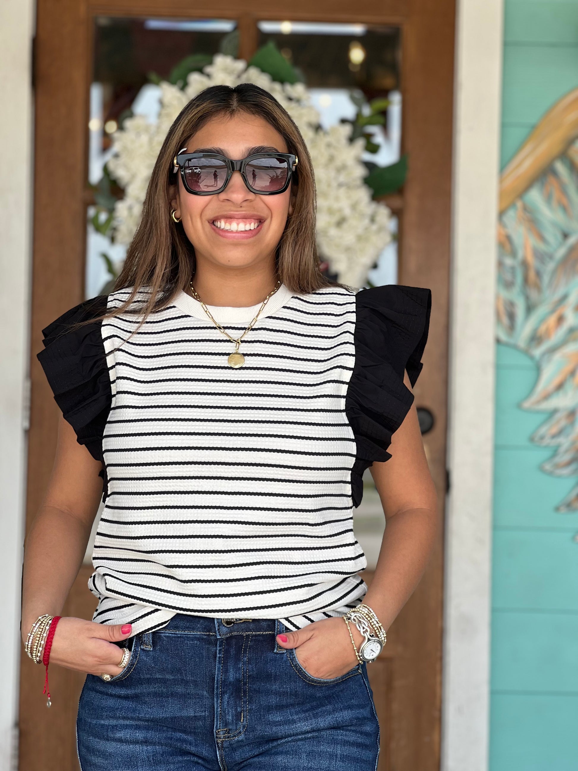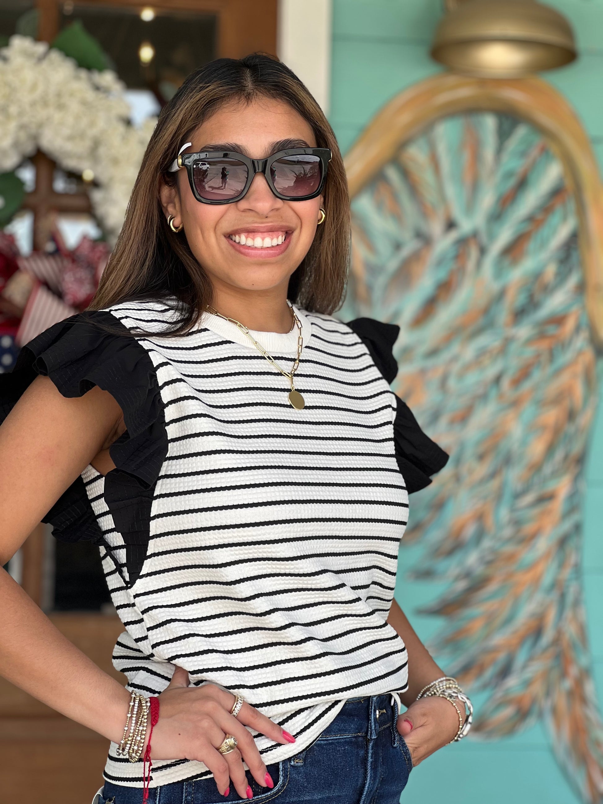 Mixed Media tee top in striped textured knit fabric. This updated t-shirt style features ruffle cap short sleeve in poplin fabric with top stitch detail, and round ribbed neck.