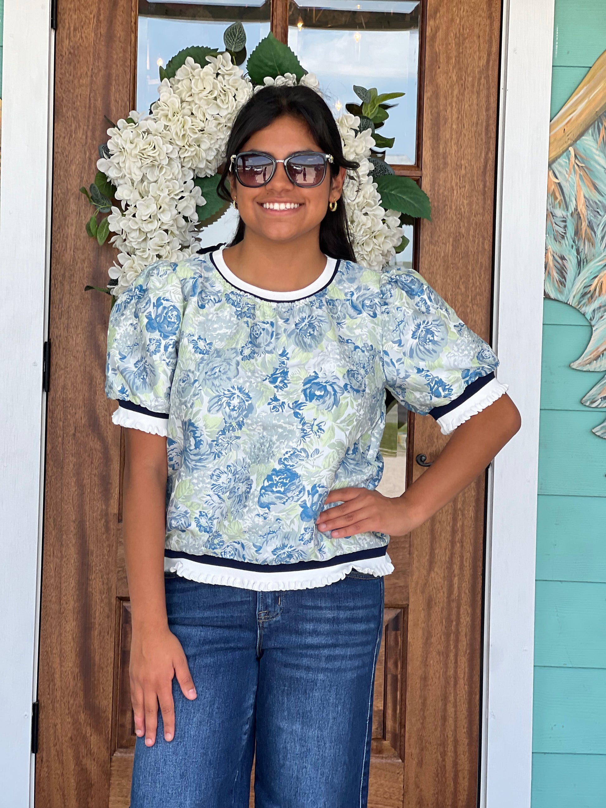 The Blue Floral Jacquard Trim Detail Top is just what you need to create an amazing ootd! It features a beautiful jacquard floral print with short puff balloon sleeves. Pair it with black pants and cute matching heels.