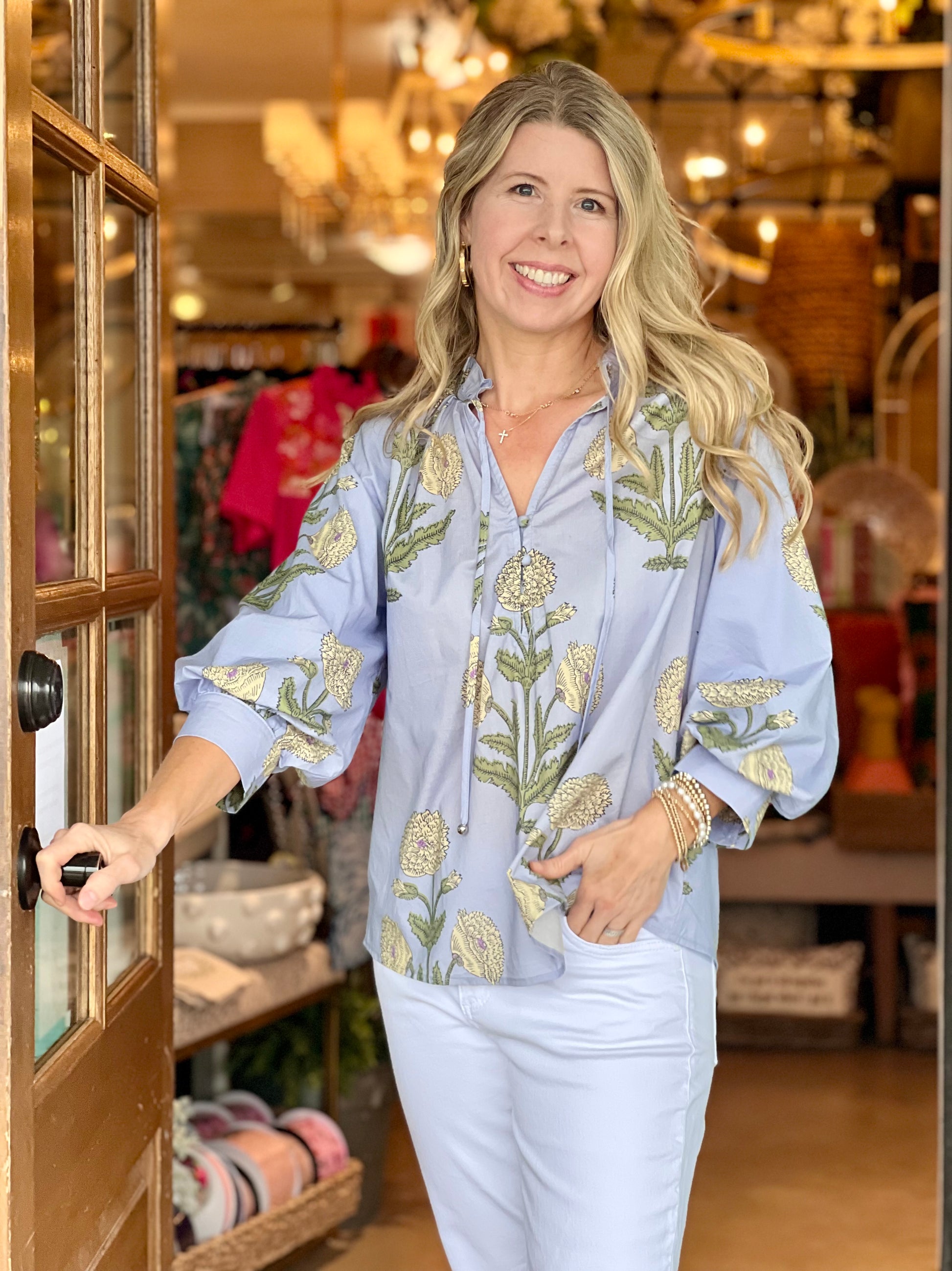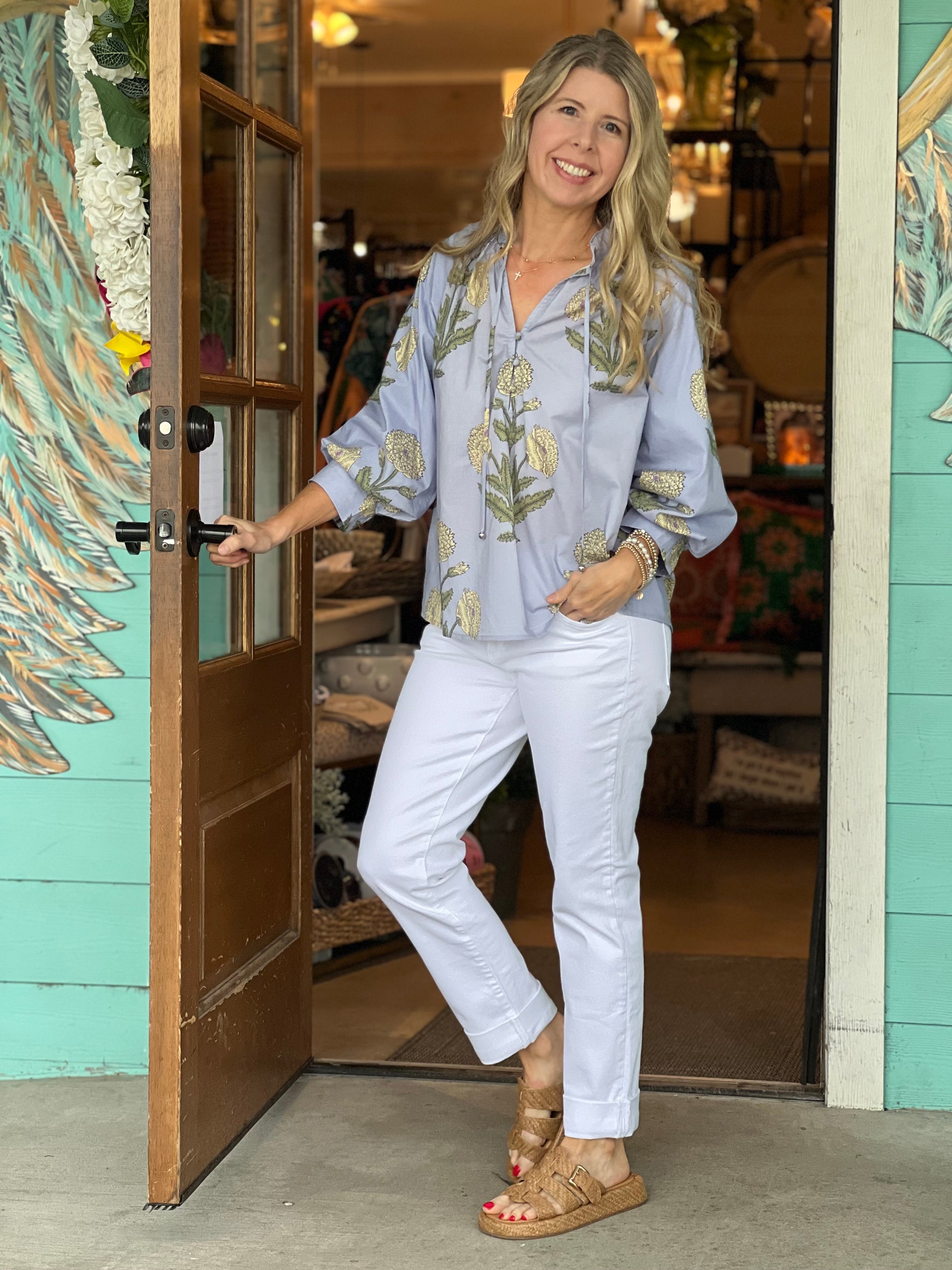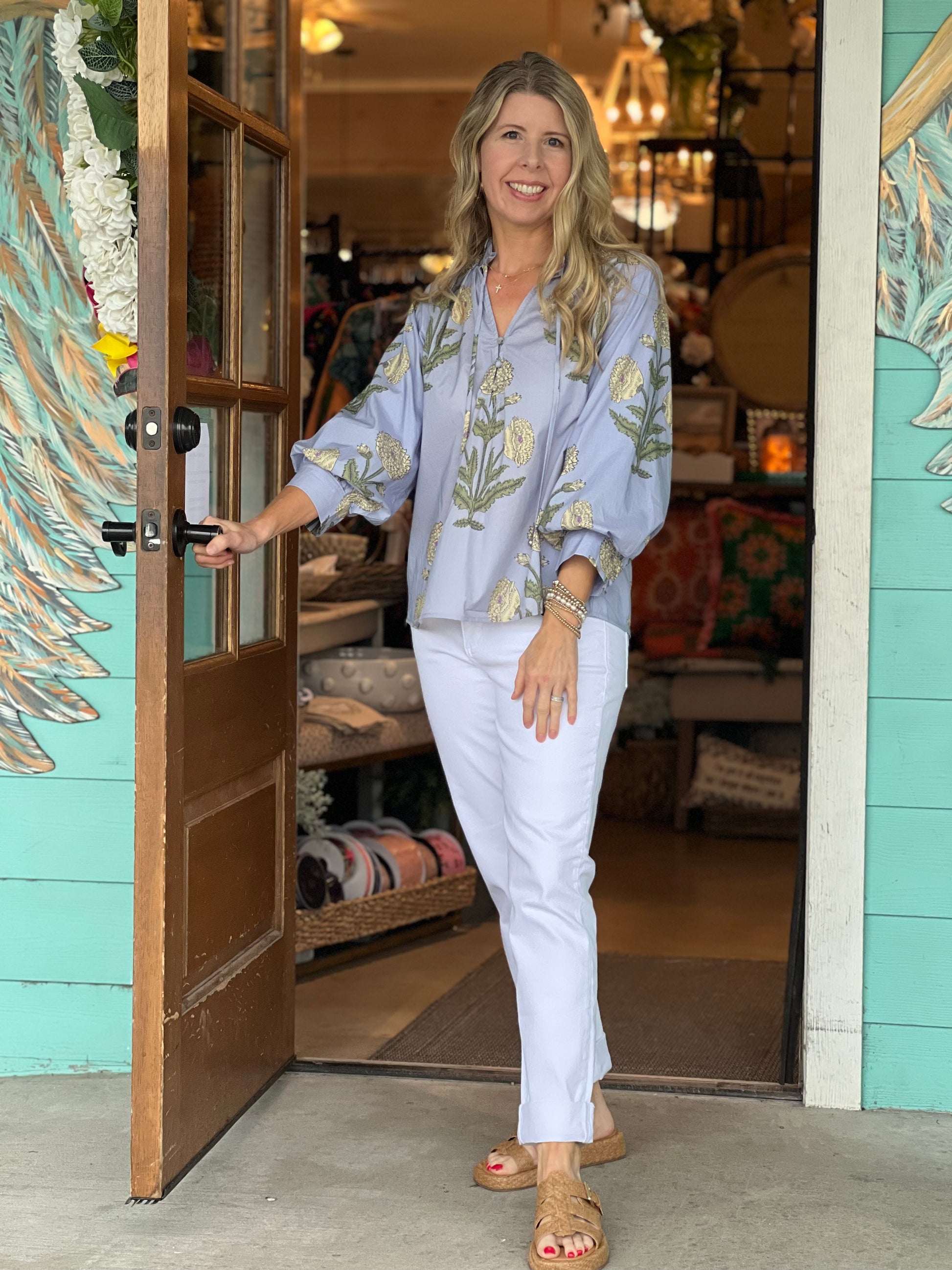 Blue Floral Print Puff Sleeve Top