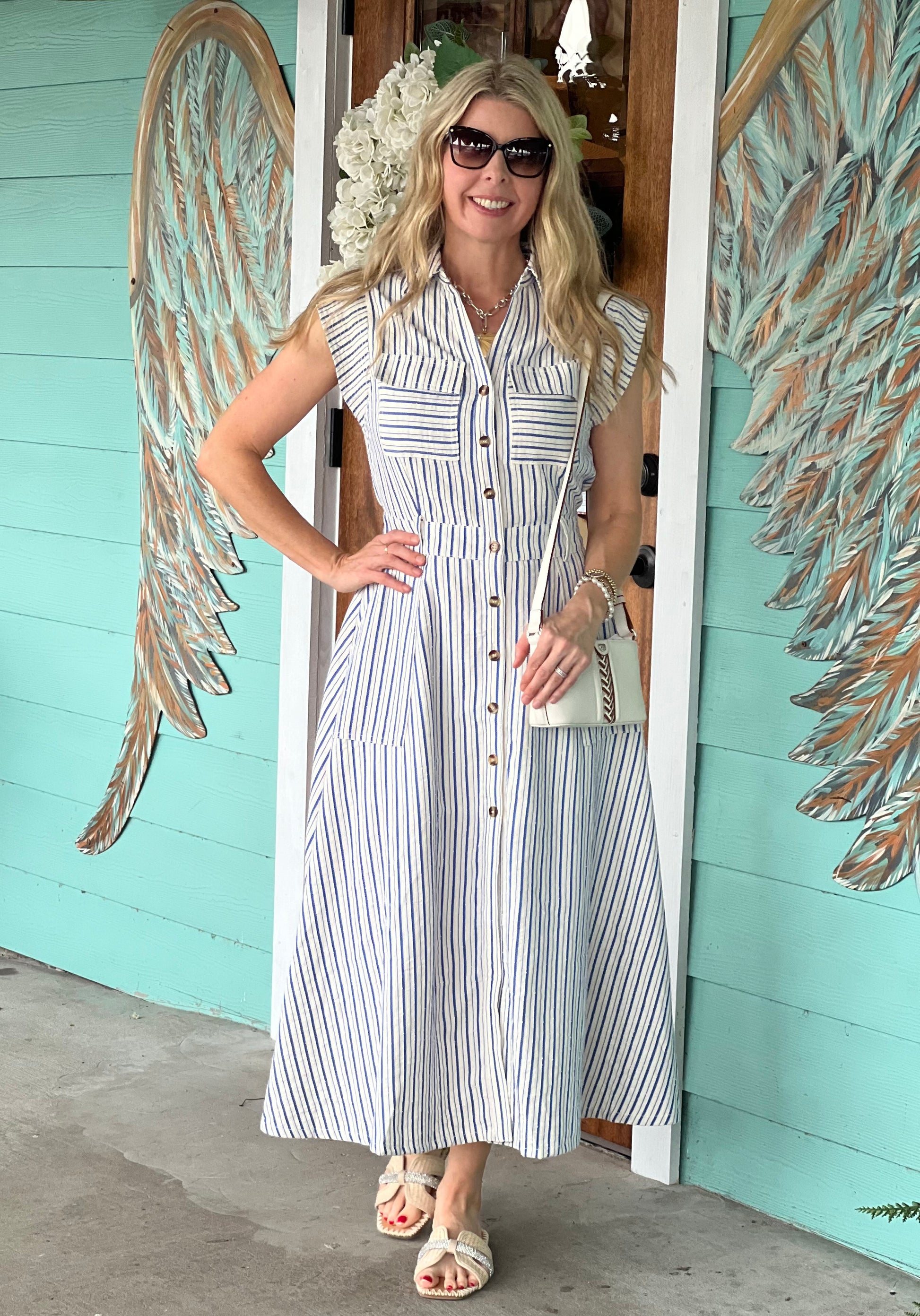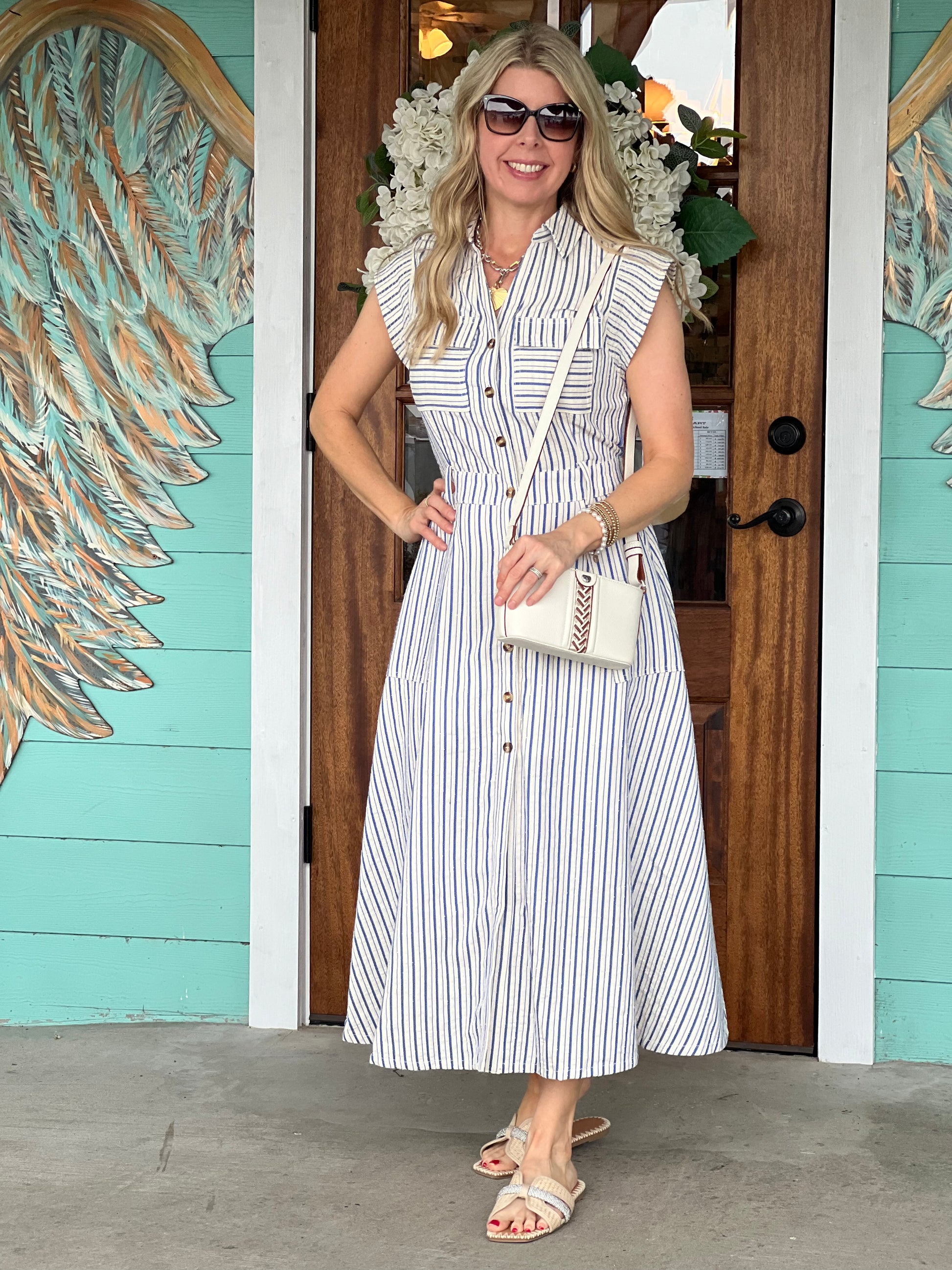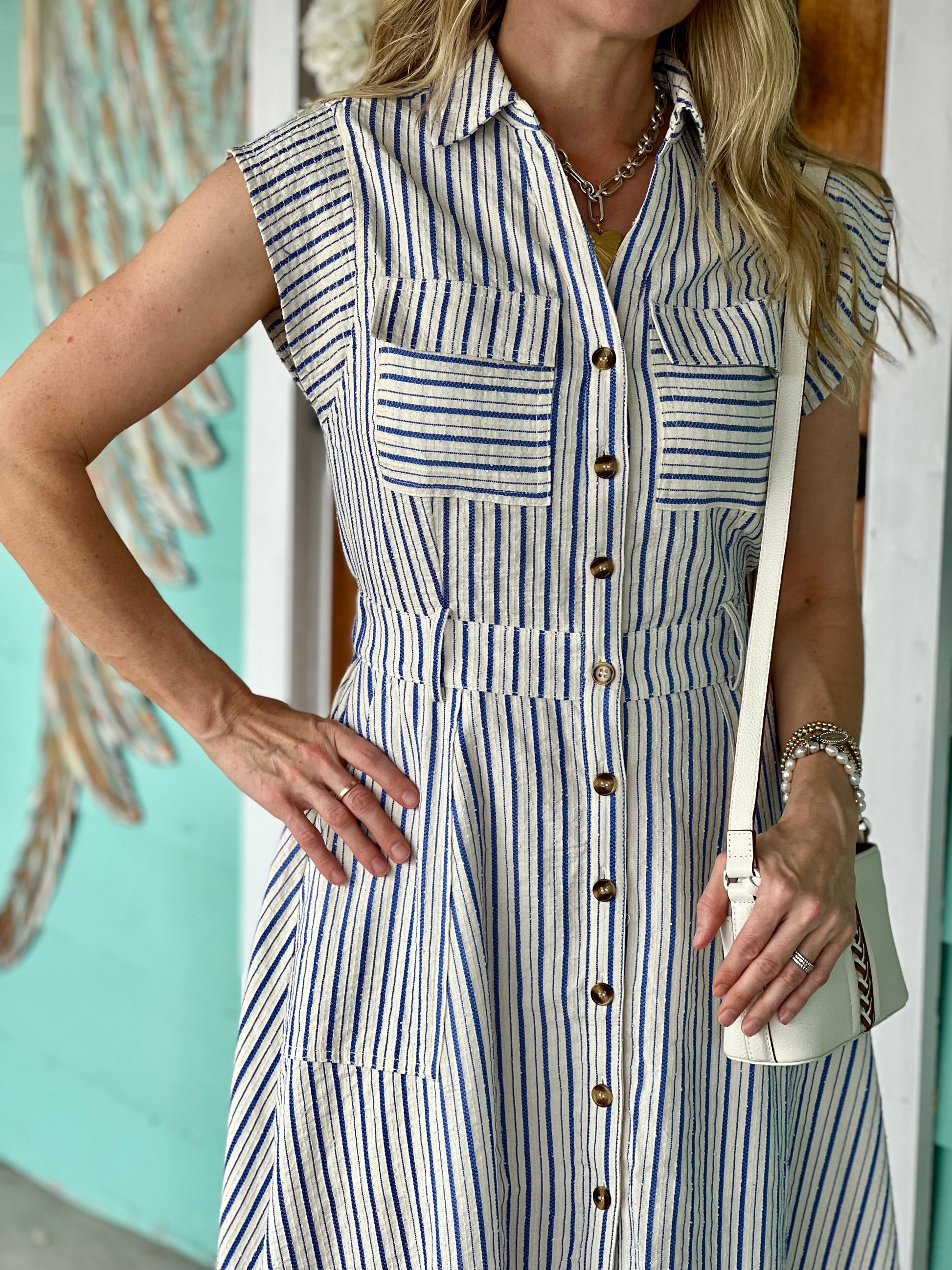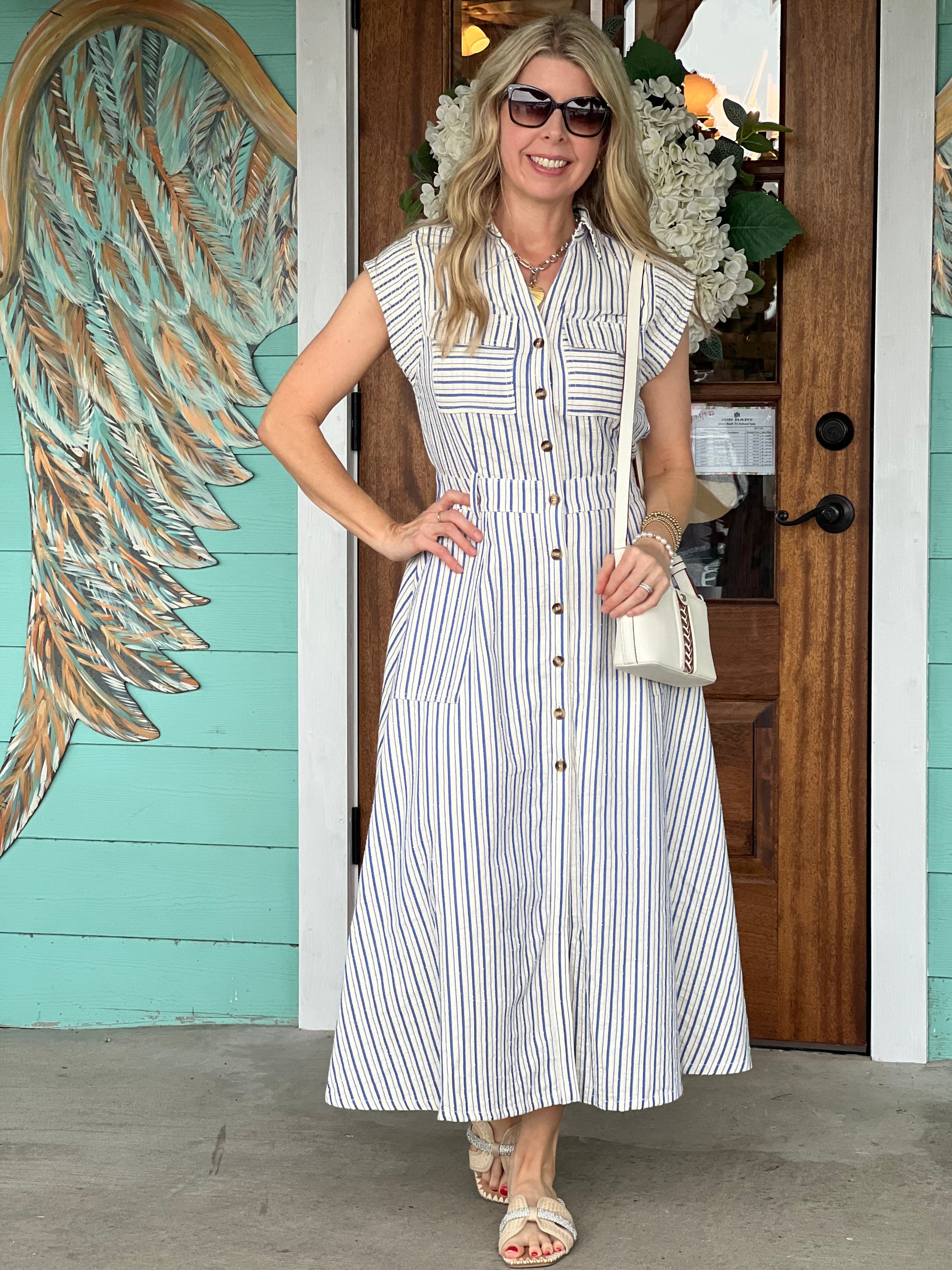 Timeless and effortlessly stylish, this Blue Striped Top Stitch Midi Dress is the perfect blend of classic and chic.