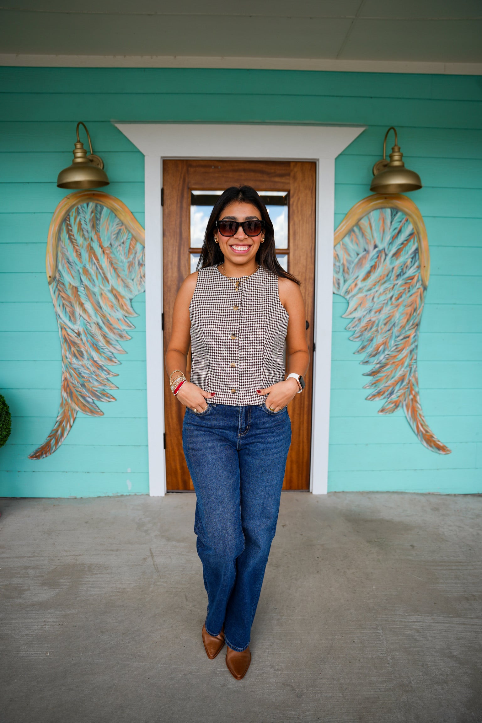 The perfect layering piece for Fall! Great under a blazer or layer a crisp white button down under this houndstooth vest.