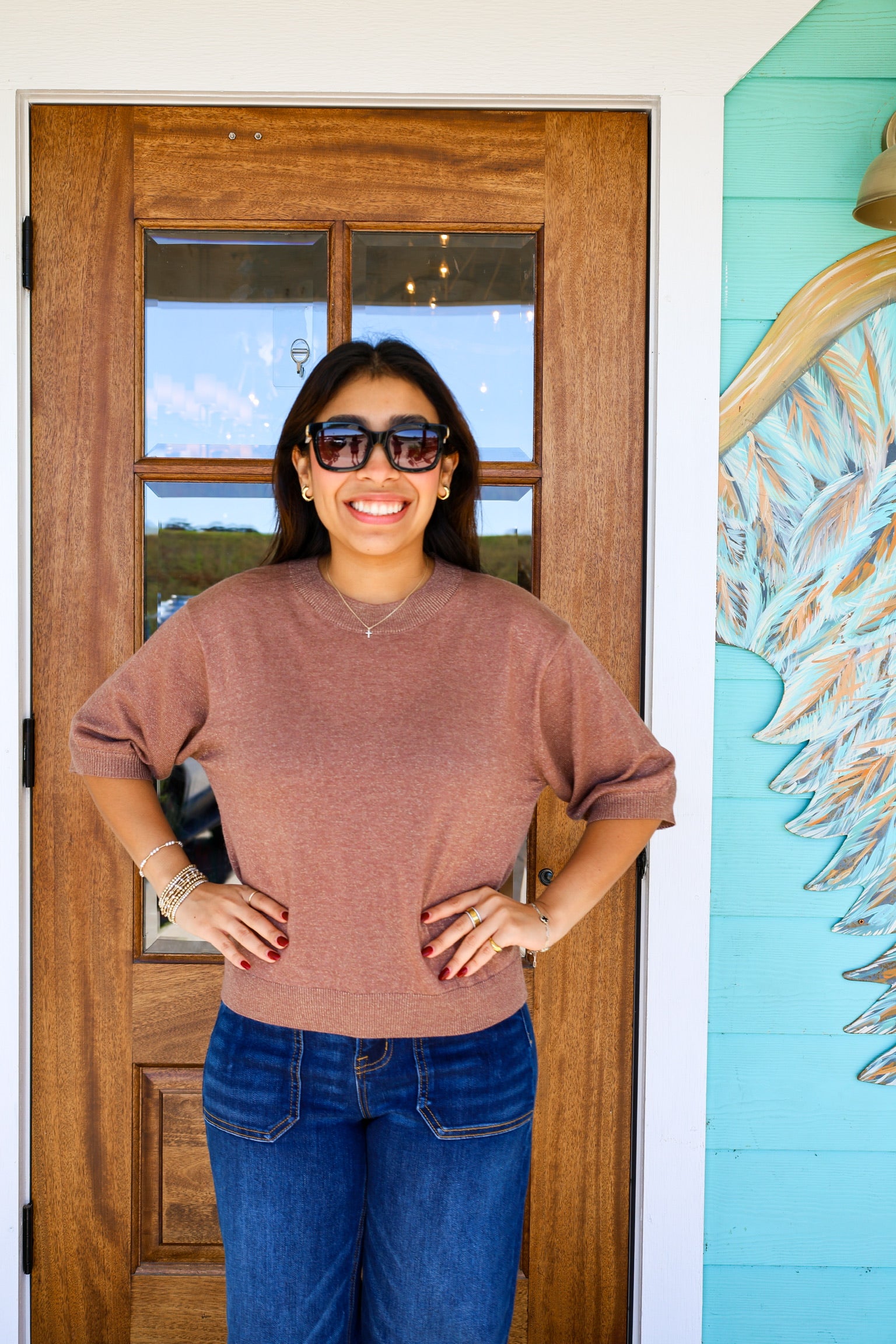 This cropped pop-over sweater with short sleeves has a light weight feel and features metallic thread detail for a touch of shine.