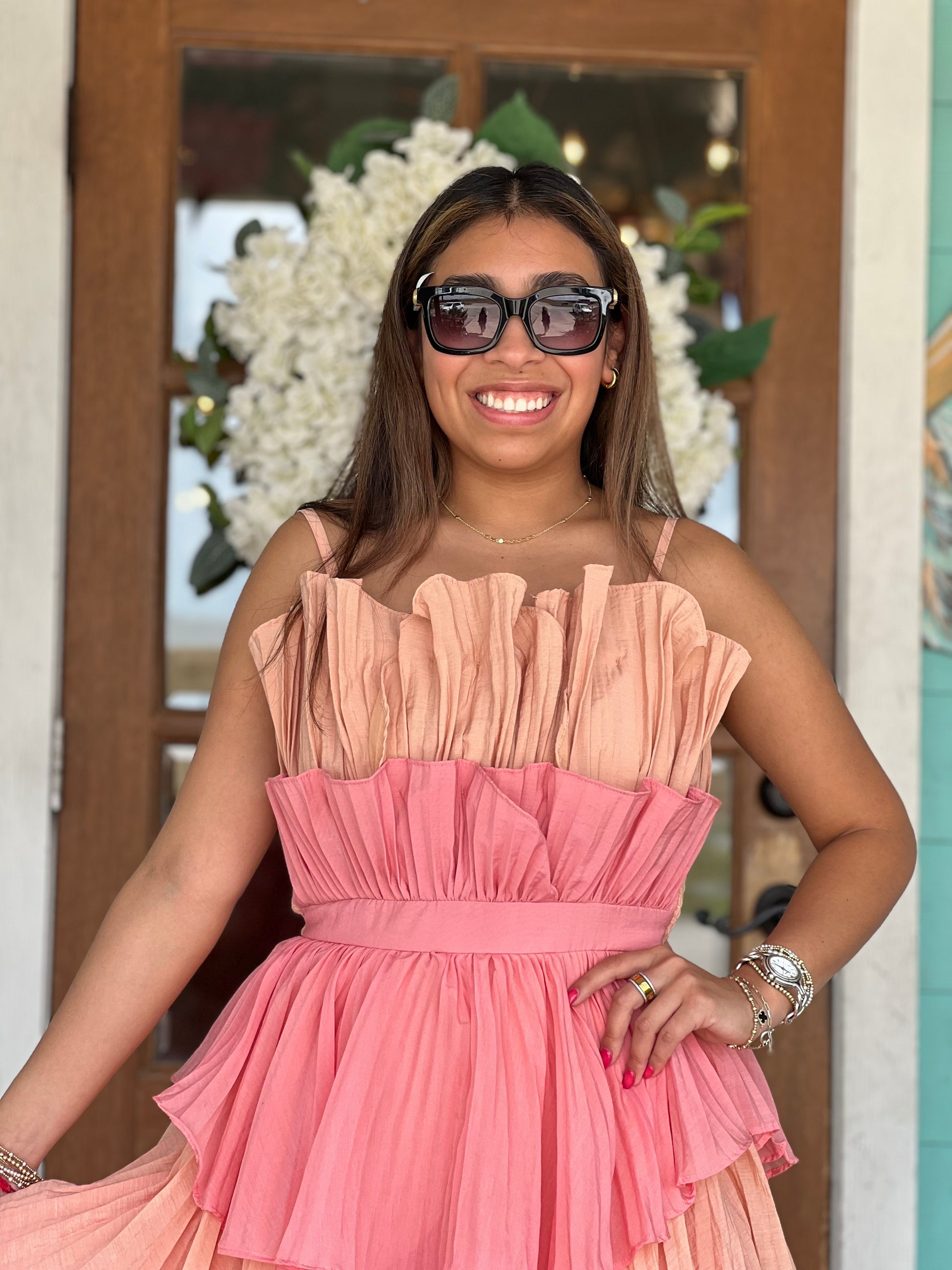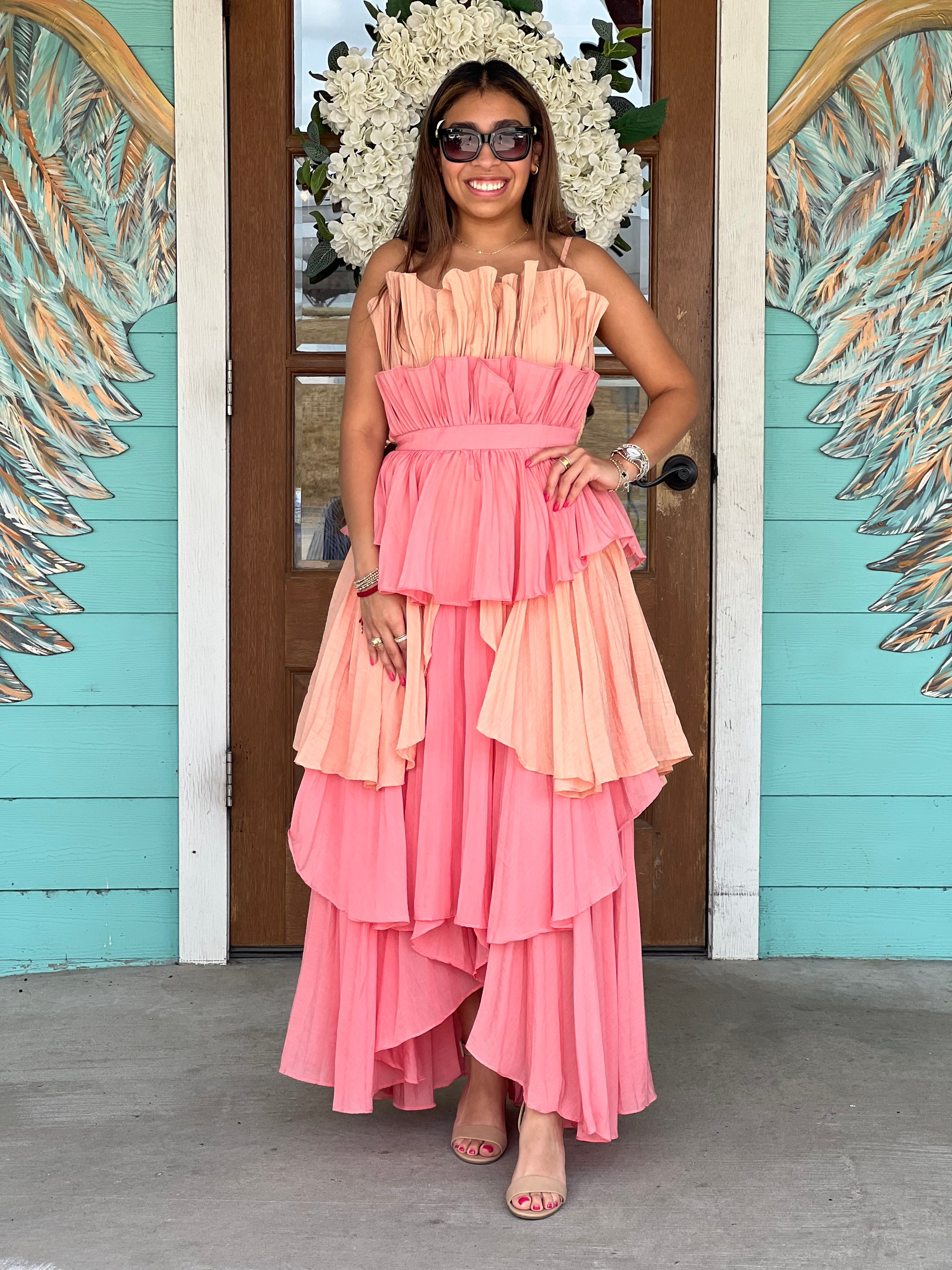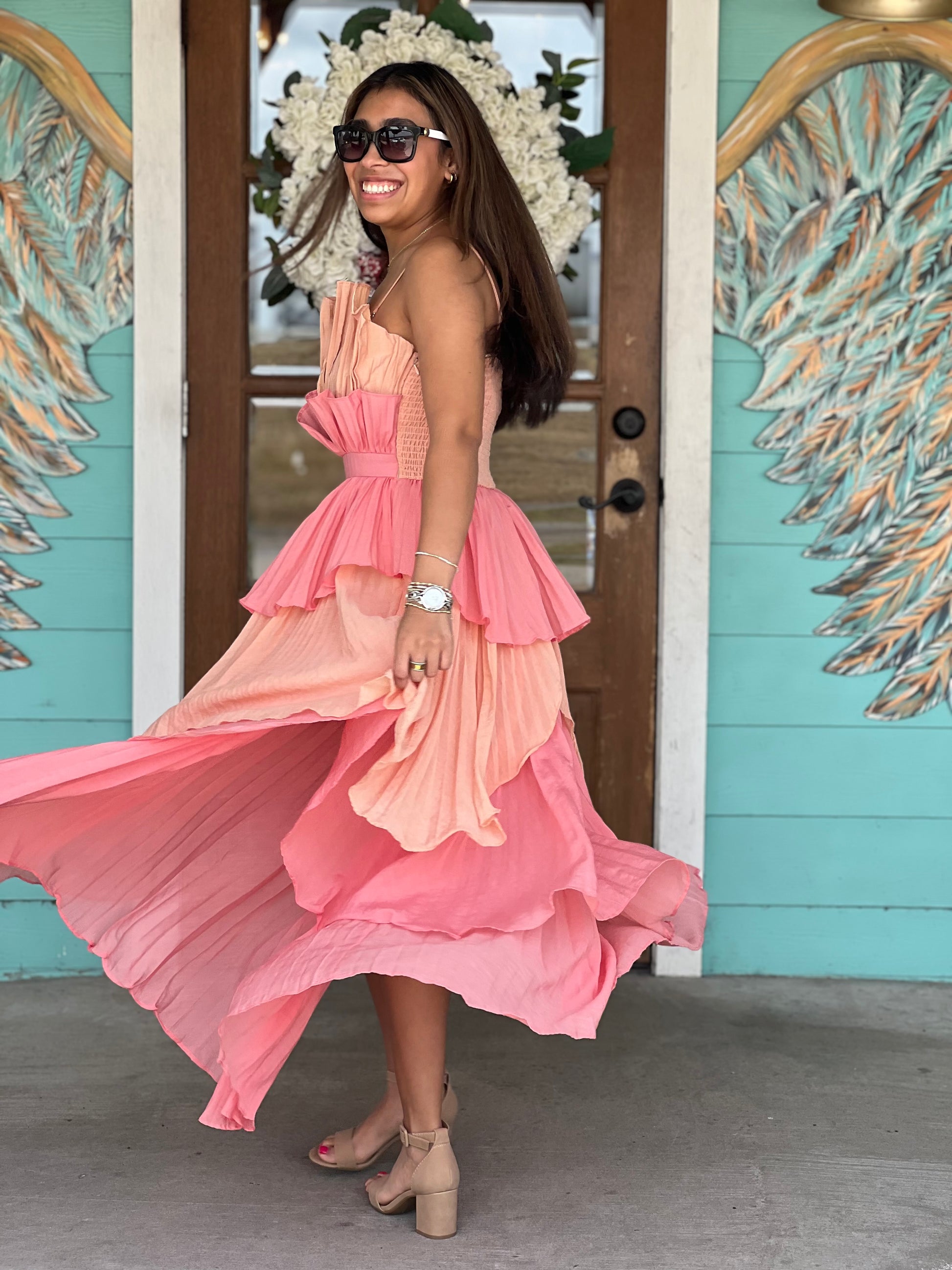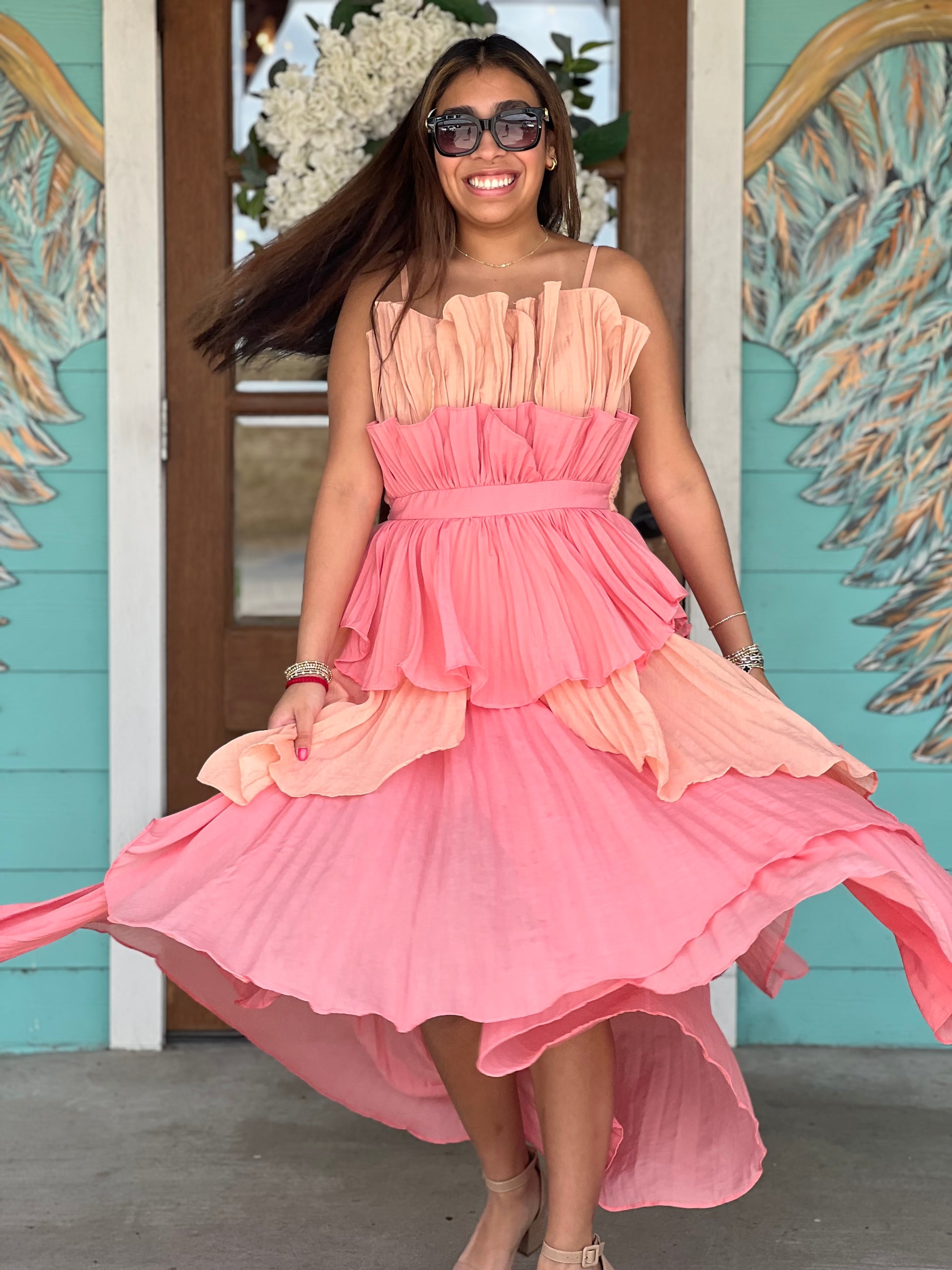 Be the life of the party in our coral Multi Layered Ruffle Dress!