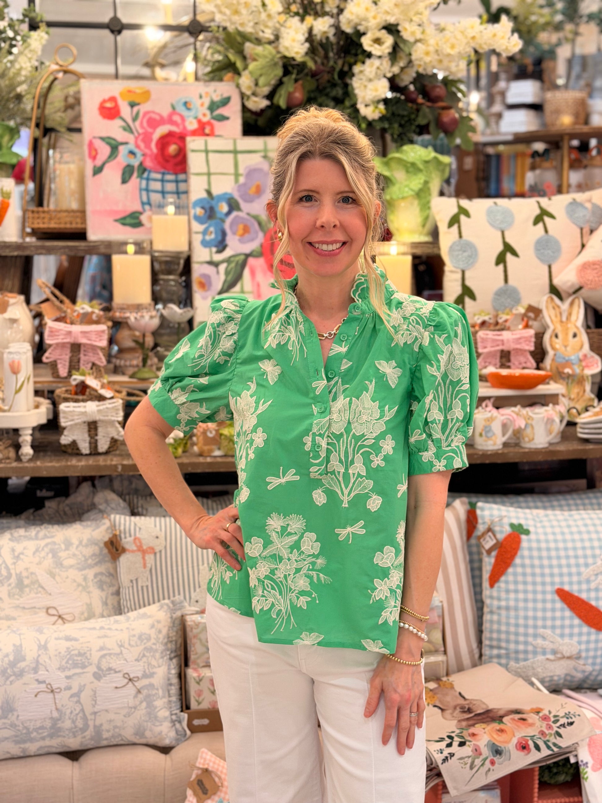 Fresh and feminine, the Green Floral Embroidery Puff Sleeve Top features delicate floral embroidery that adds texture and charm. Designed with soft puff sleeves and a flattering silhouette, this lightweight top offers effortless comfort with elevated detail.