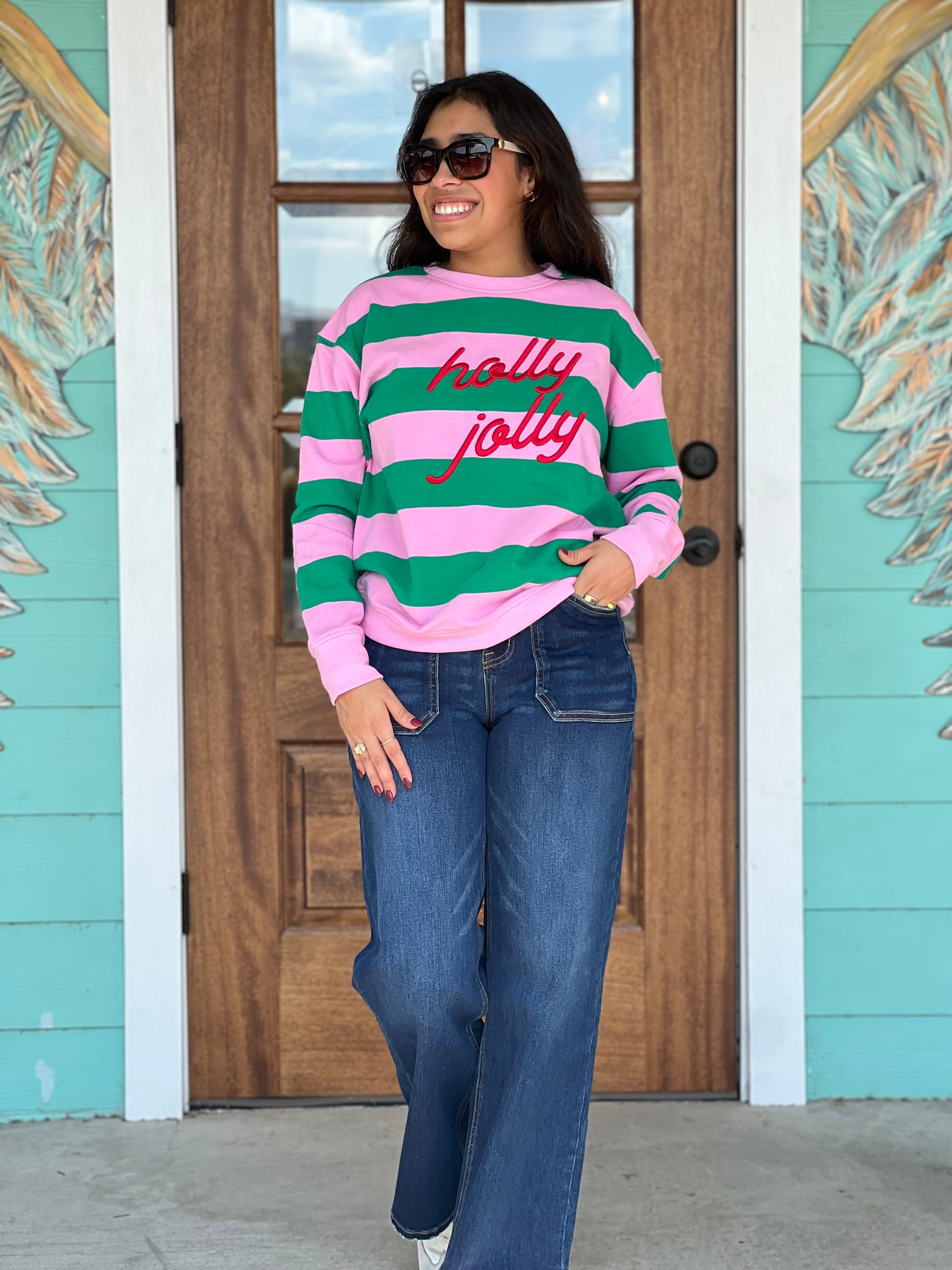Bring the holiday cheer in full color with the "Oh What Fun" Lounge Sweatshirt. This cropped crewneck features bold green varsity-style lettering outlined in gold embroidery, all set against a playful pink background. Its relaxed fit makes it perfect for lounging, gift wrapping, or matching with your crew. Pair it with the coordinating Checkered Boxer Shorts or Festive Stripe Boxer Pants—or mix and match with any of our other merry pieces for a festive look from head to toe.