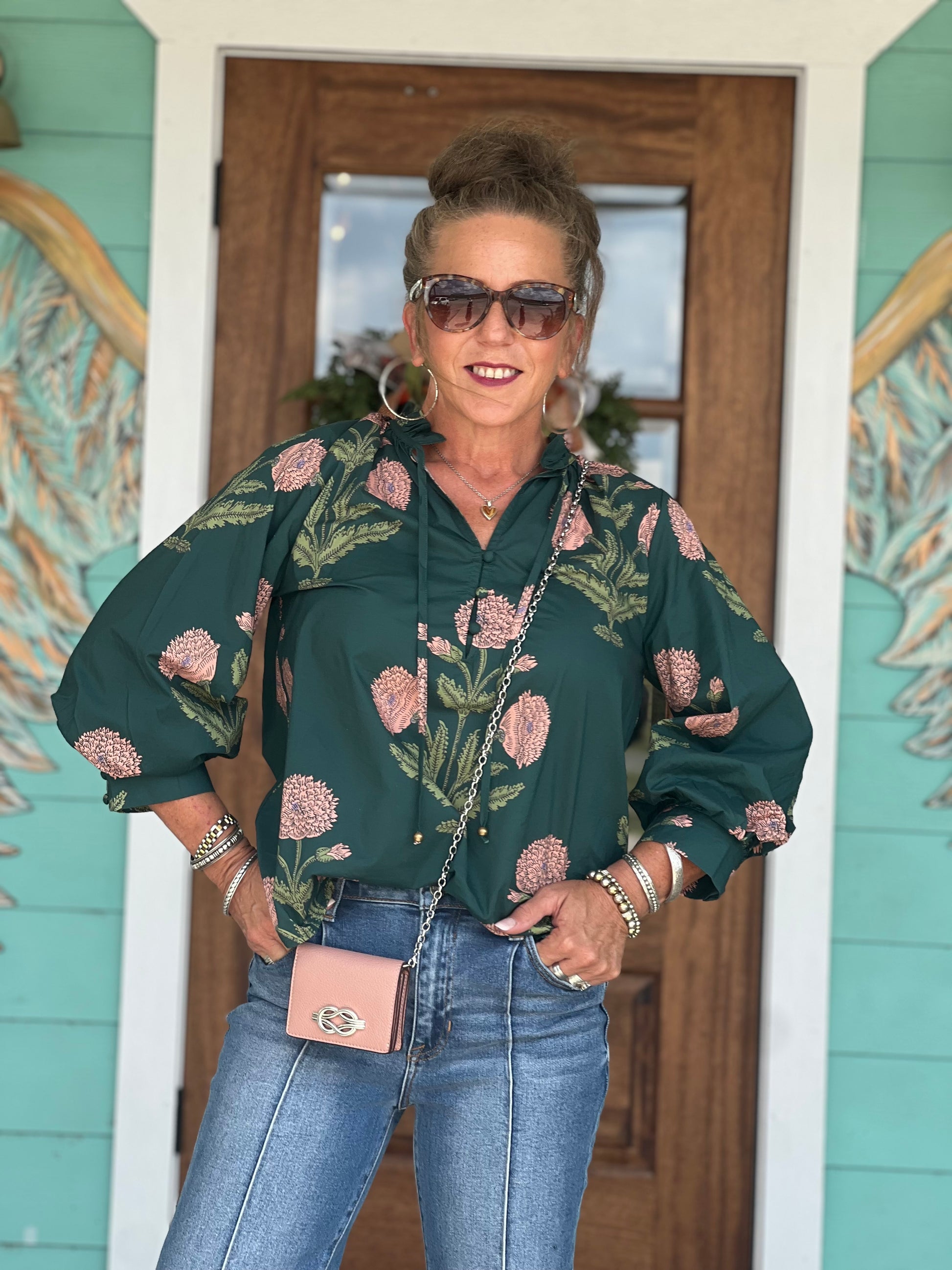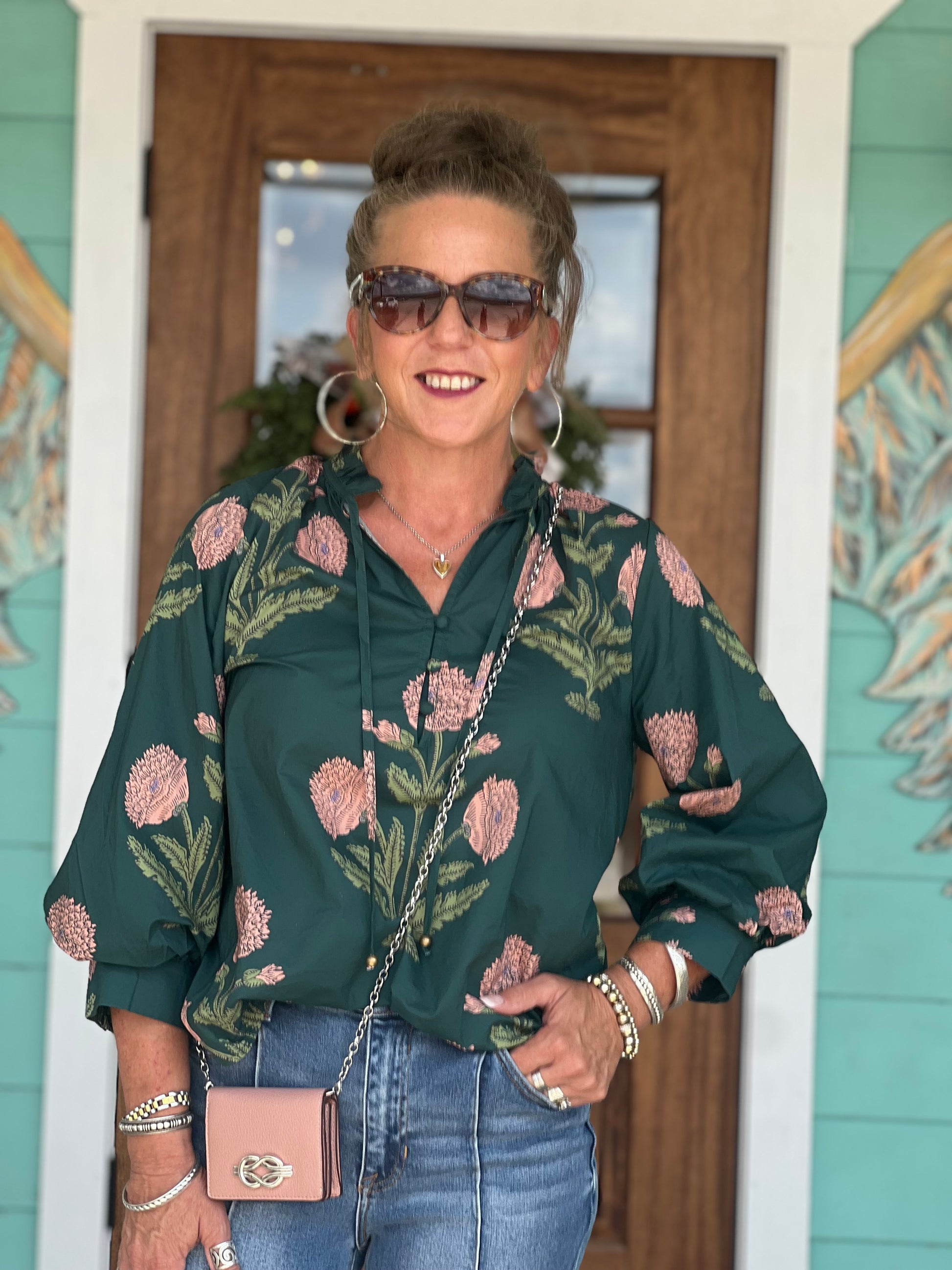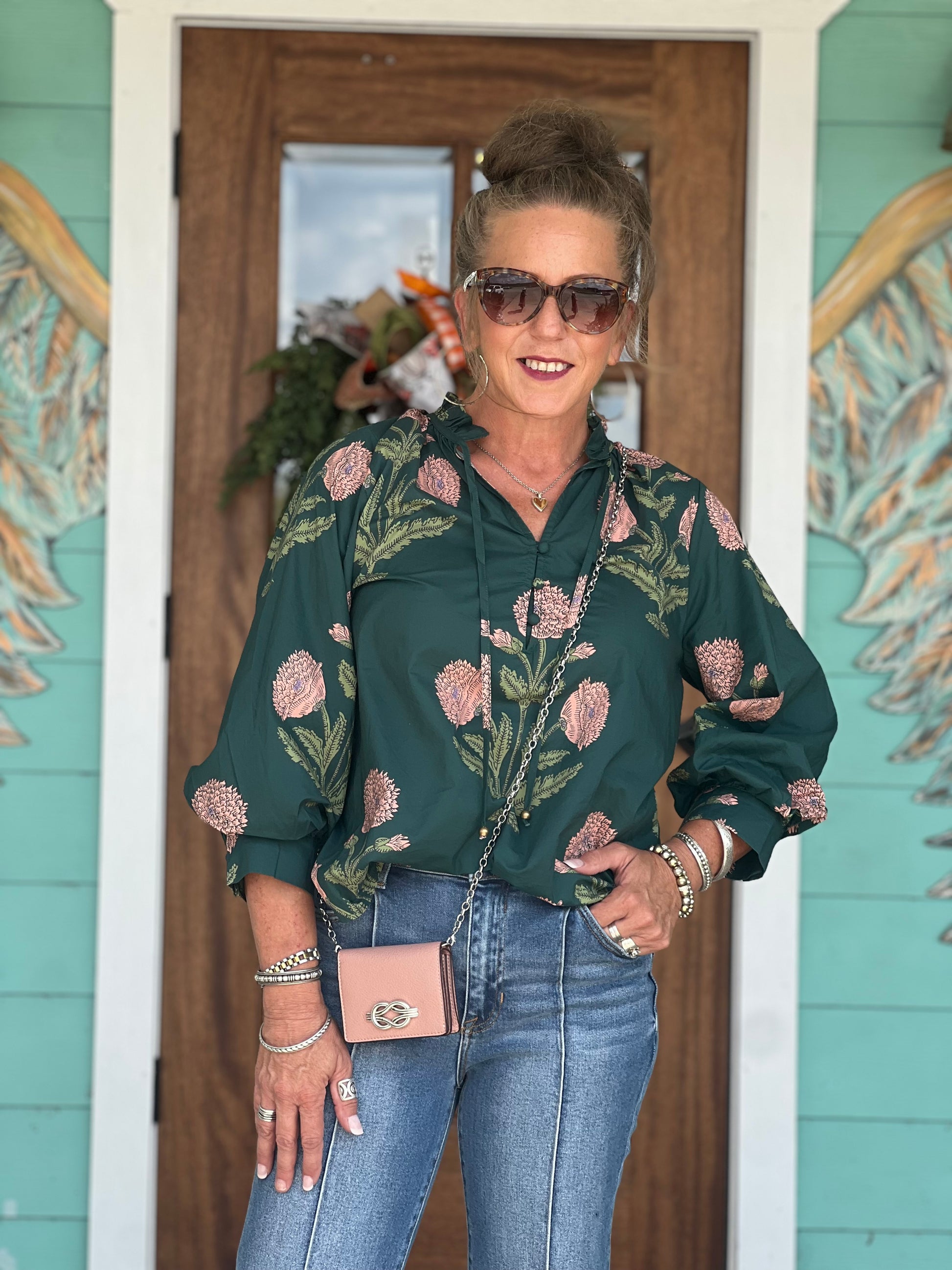 This garden-inspired top is blooming with personality and effortlessly chic charm! The rich hunter green and floral print bring major vintage vibes, while the tie neckline adds just the right touch of flirt. Pair it with denim and you're instantly ready for coffee dates, farmers markets, or a day with the girls!