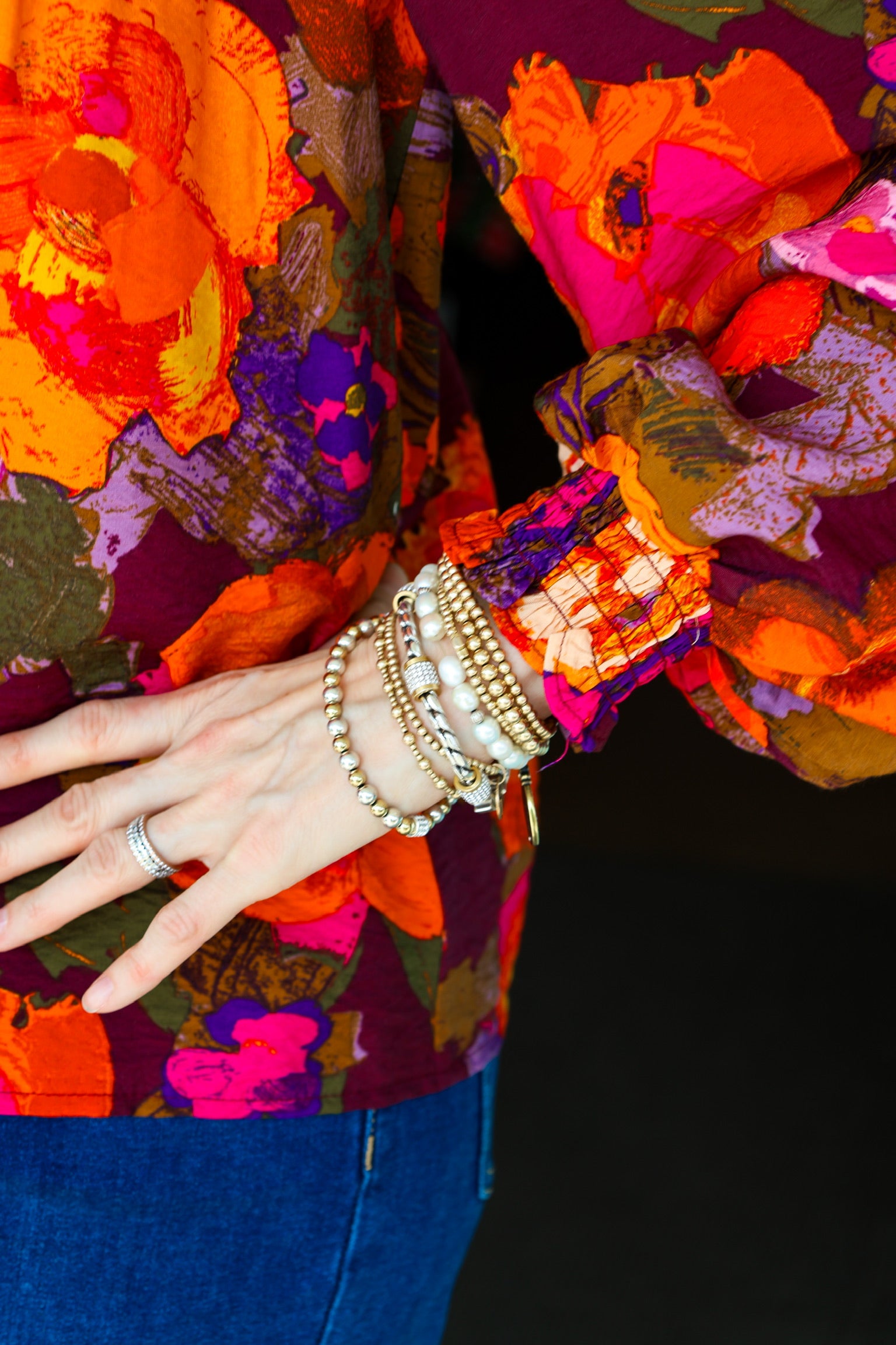 This blouse is definitely ready for you! It's so bold and fun! That floral print is so vibrant and we love the flowy cut of this blouse. You are going to love styling this blouse with everything from your favorite jeans to tailored trousers.