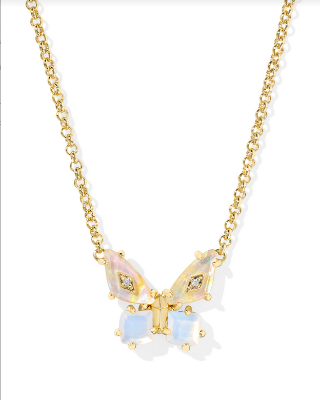 Add a touch of romance to any necklace stack with the Bianca Butterfly Gold Iridescent White Mix Short Pendant Necklace. Featuring an artfully arranged butterfly shape made of color-coordinated stones with sparkling beauty marks, this necklace is a must-have for your collection.