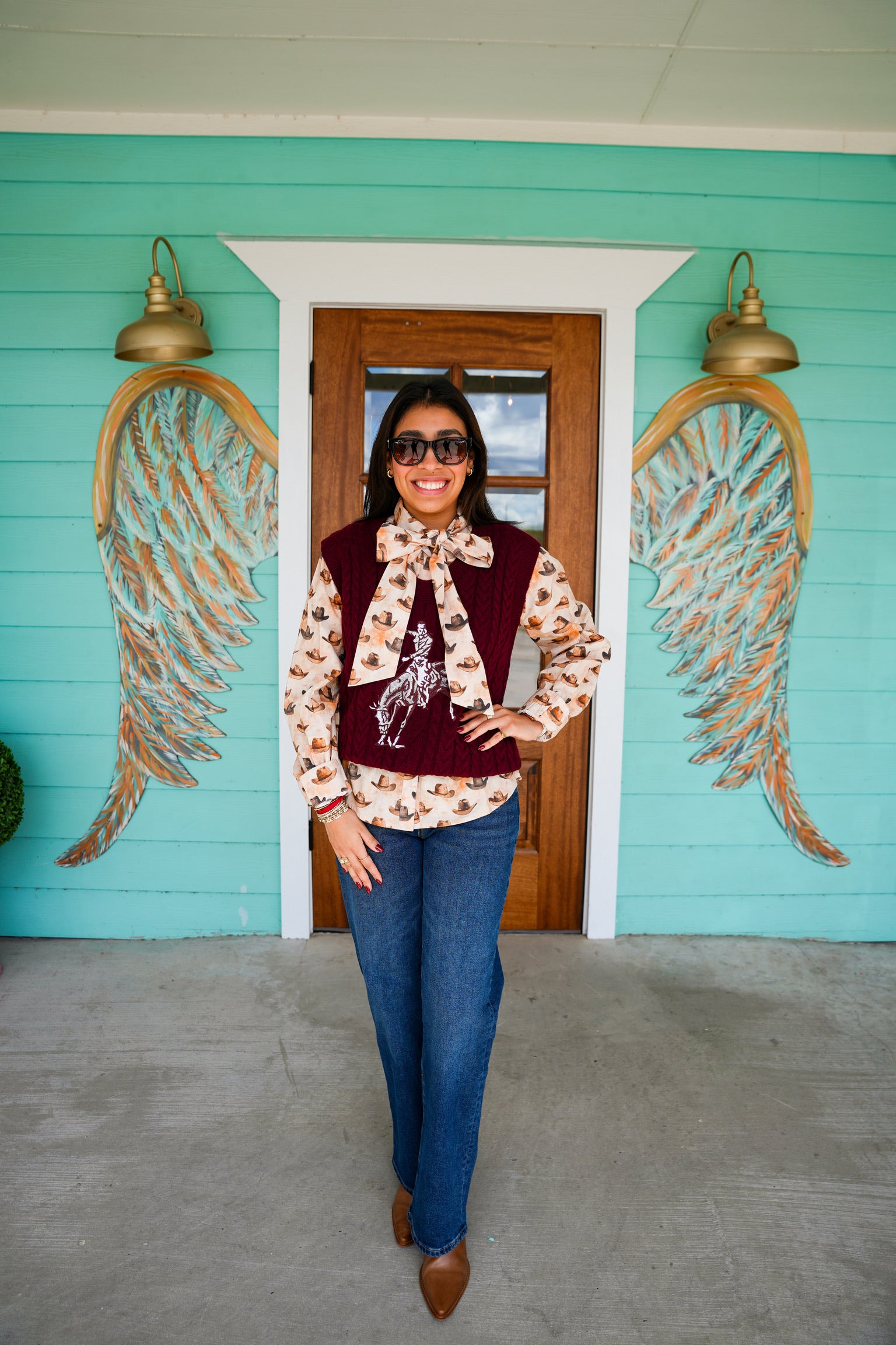 For the wild at heart but bold in style. Did we mention it's great for layering? This bold sweater vest includes a fun embroidered bucking horse graphic knit into a beautiful maroon fabric.