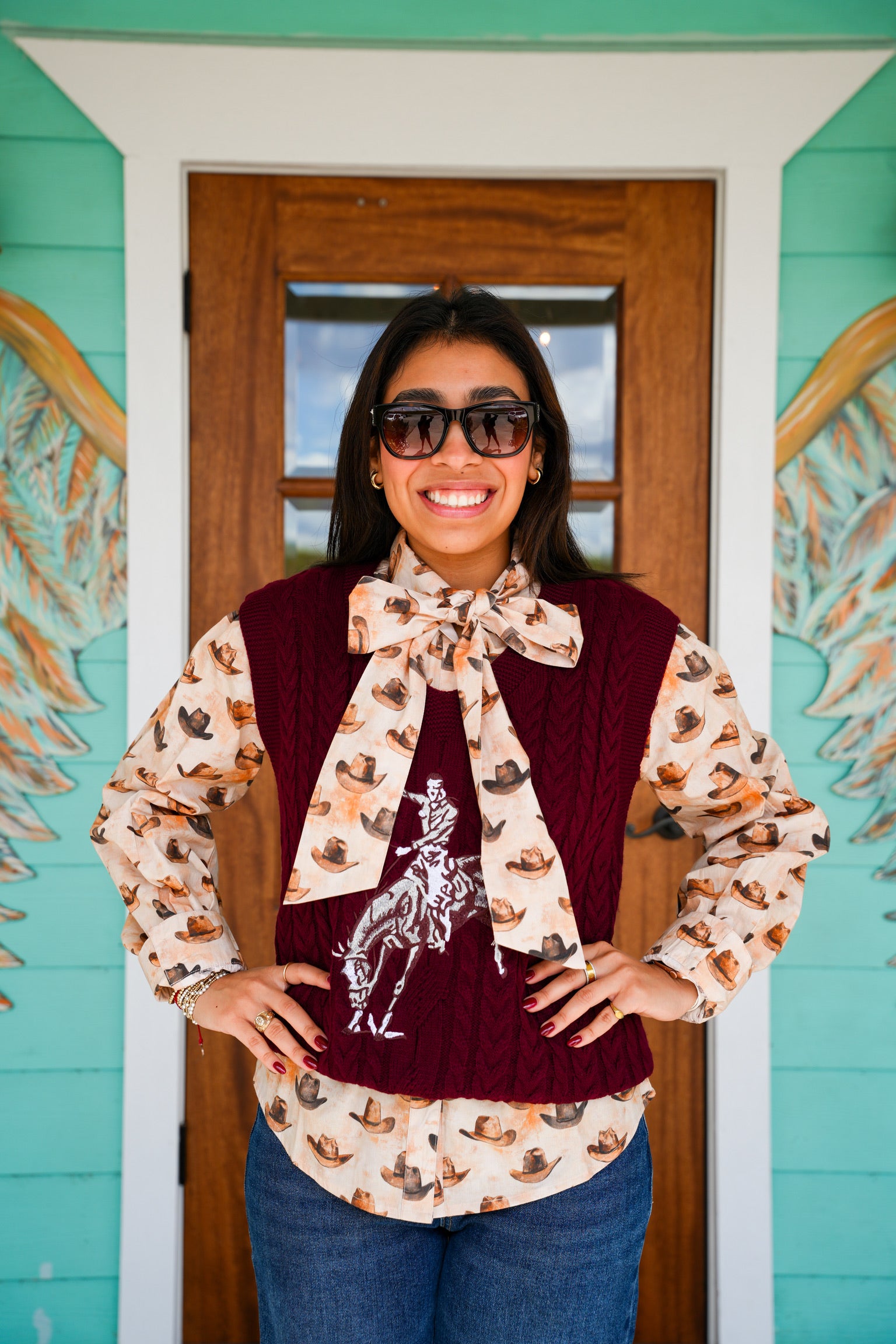 Cute, comfy, and western-inspired. This fun tie-top features multi-color cowboy hat graphics, and has flowy easy-going fit.