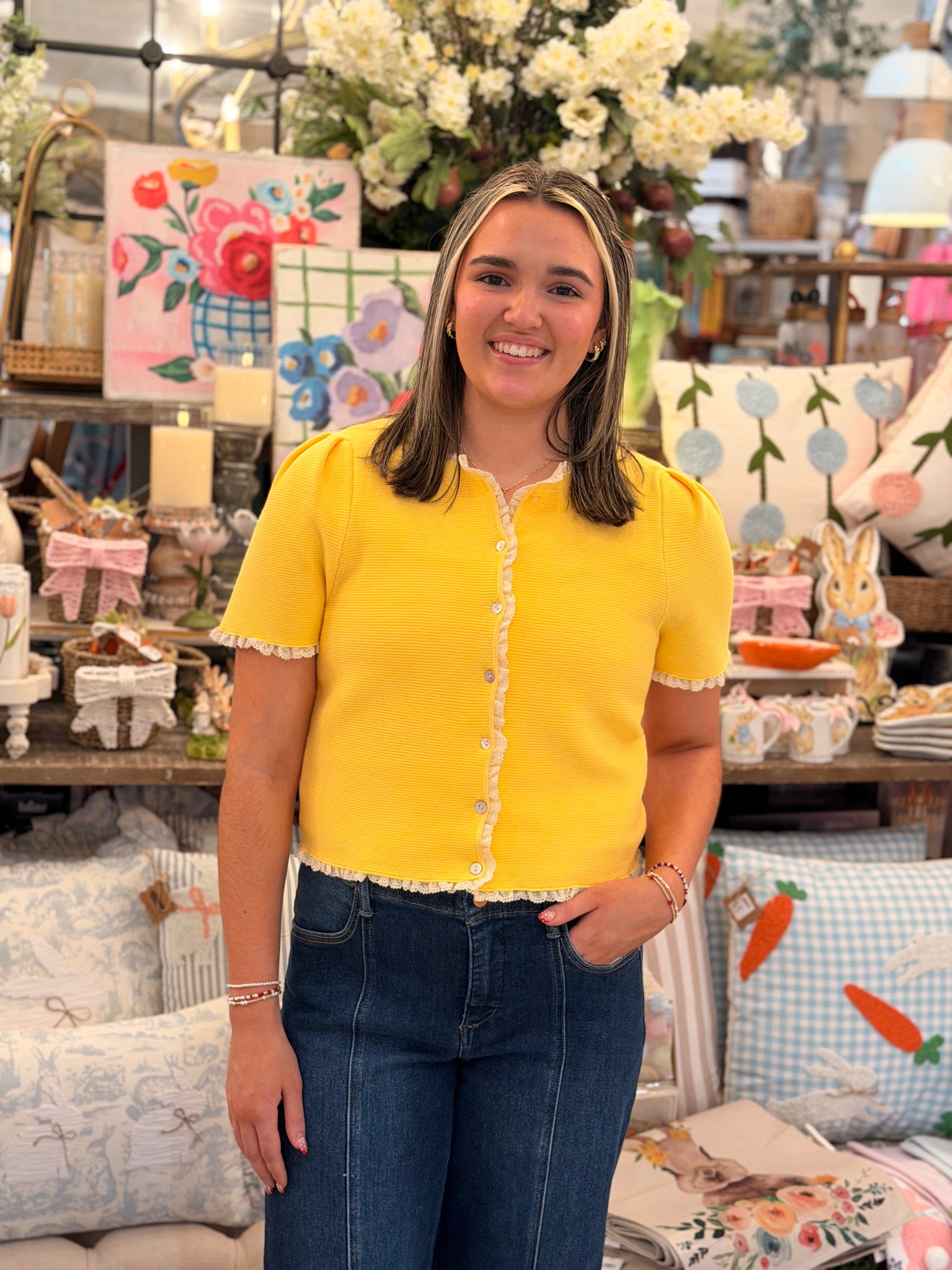 Add a cheerful layer to your wardrobe with the Lemon Crochet Trim Cardigan. Designed in a soft, lightweight knit, this cardigan features delicate crochet trim that adds texture and feminine charm. Easy to layer and effortlessly polished.
