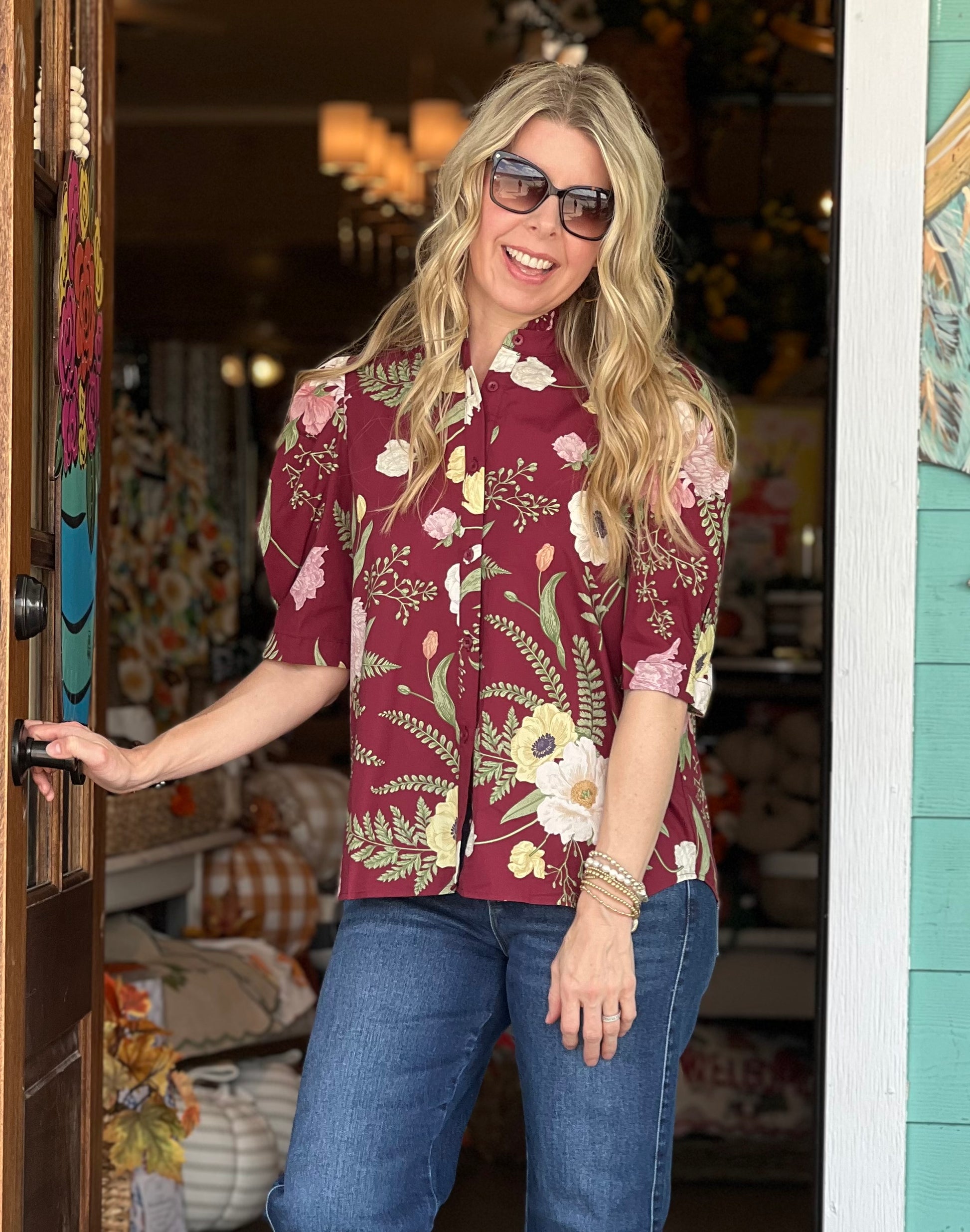 Floral print ruffled neck button front closure featuring pleated short puff sleeve.