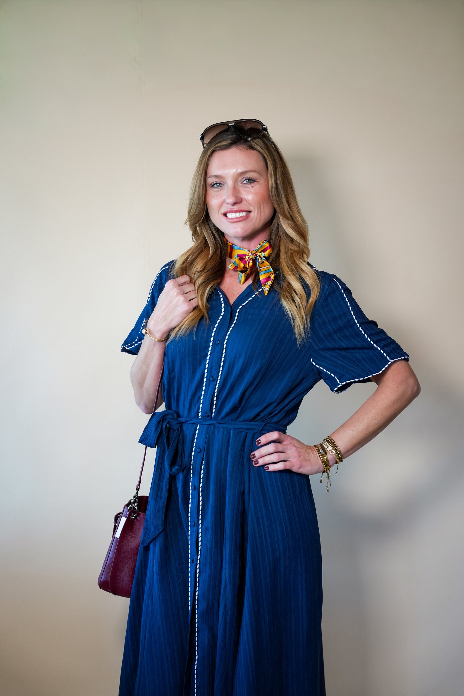 Polished and effortlessly sophisticated, the Navy Contrast Detail Belt Dress is a timeless piece designed to elevate your everyday style. The rich navy hue creates a classic foundation, while crisp contrast detailing adds a modern, eye-catching touch.