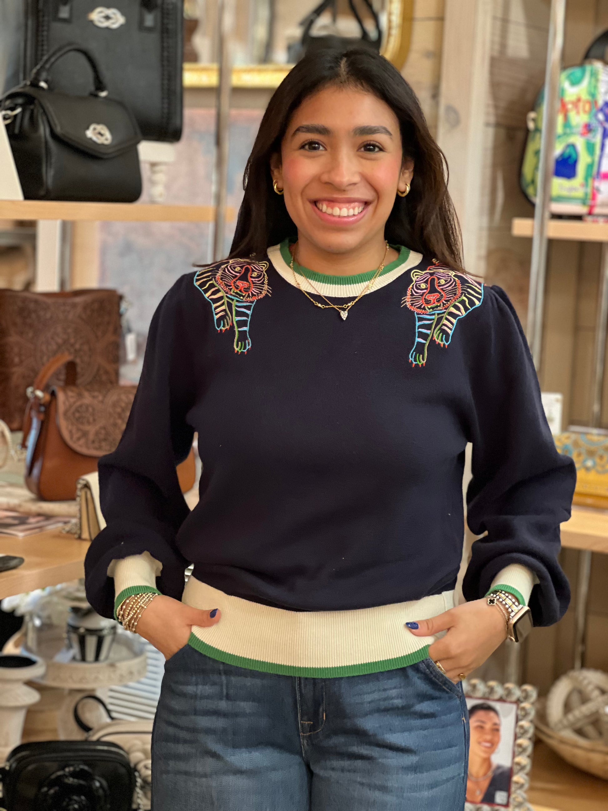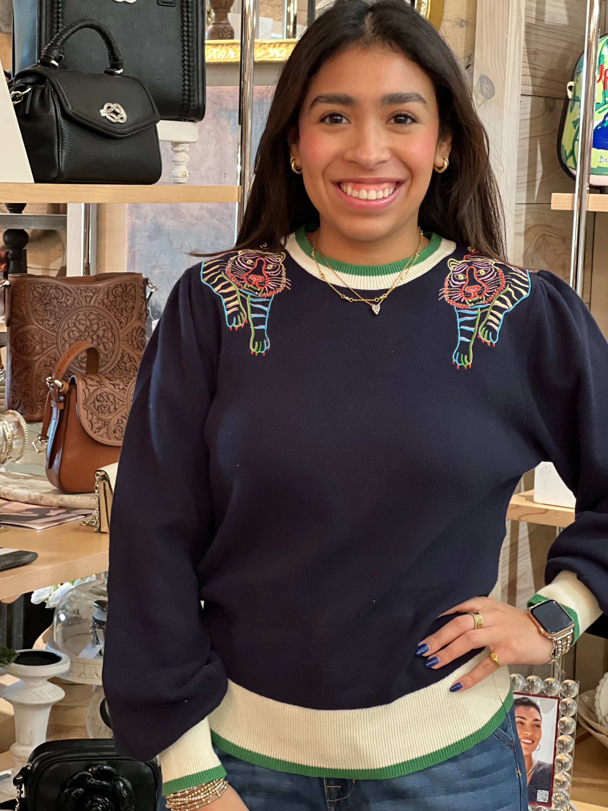 Crafted in a rich navy hue, this Tiger Embroidered Sweater exudes refined style with its intricate tiger motif. Designed for those who appreciate subtle statement pieces, it offers both comfort and elegance, making it a versatile addition to any sophisticated wardrobe.