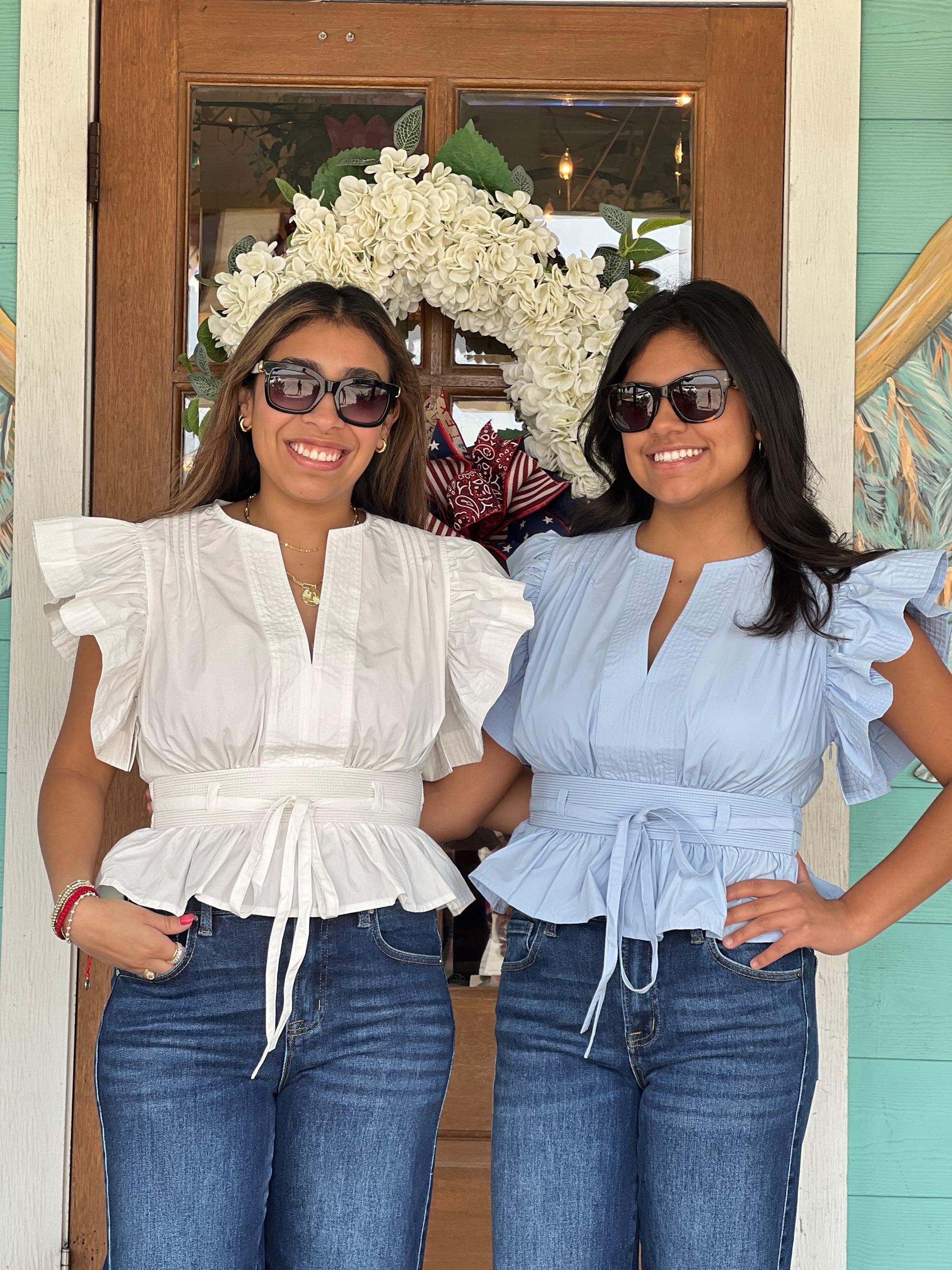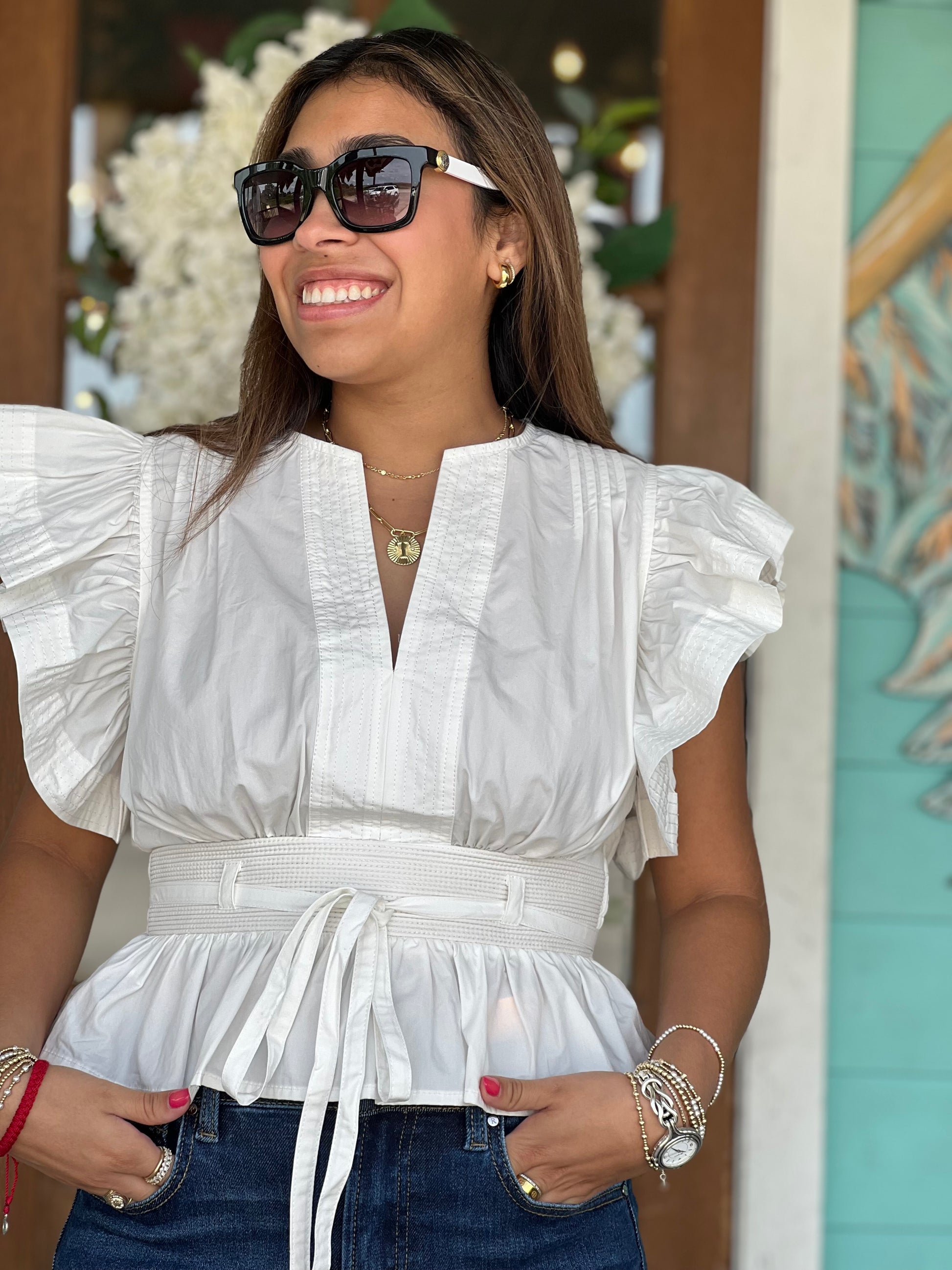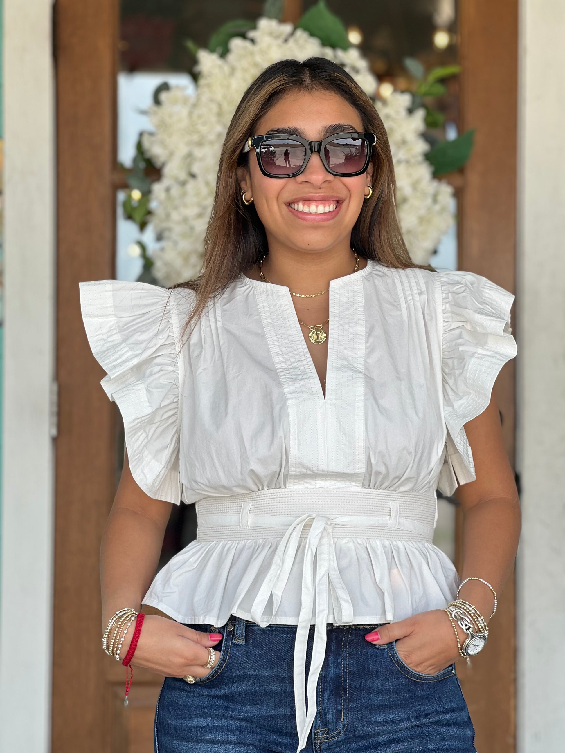 The definition of pretty. The Off White Flutter Sleeve Peplum Top features airy, romantic flutter sleeves, a v-neckline with a delicate tie-front, and a softly gathered peplum hem that creates the perfect hourglass shape.