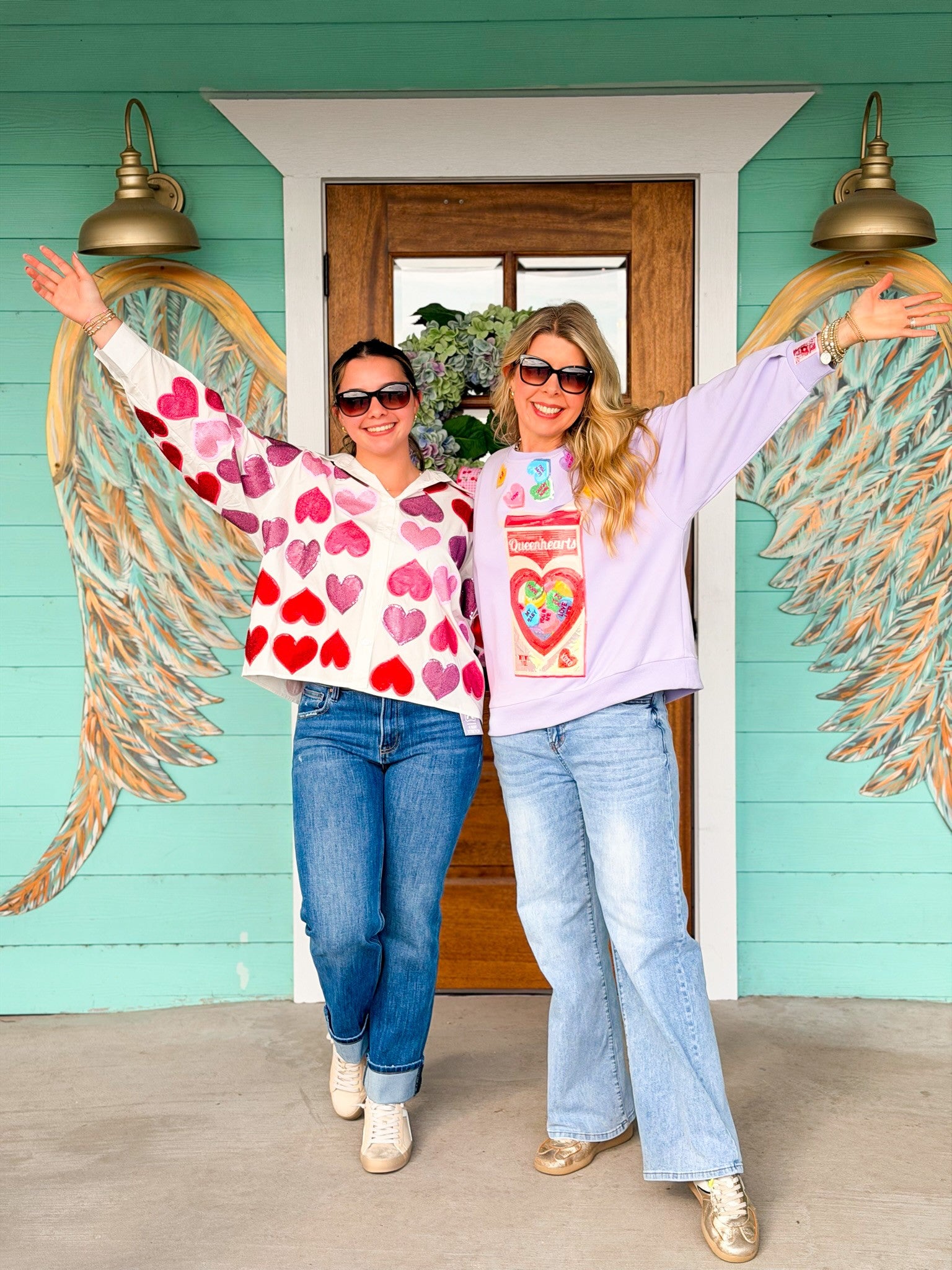 Shine bright like the queen you are in this dazzling white cotton button-up! Adorned with sparkling multi-colored rhinestone hearts, this playful top brings instant glamour to any outfit!