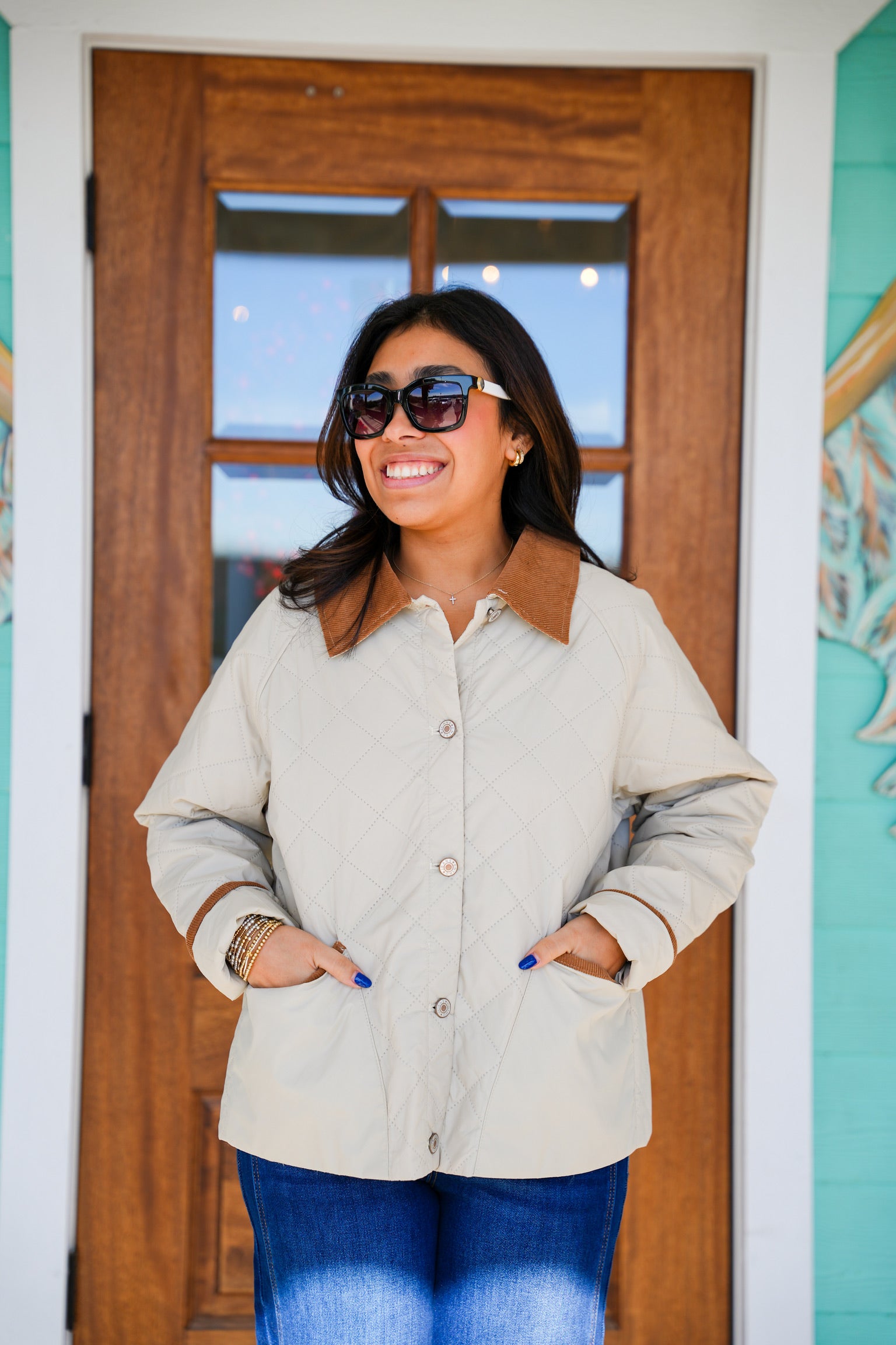 Solid diamond pattern quilted long sleeve jacket featuring contrast collar and accent binding. Front Pockets.