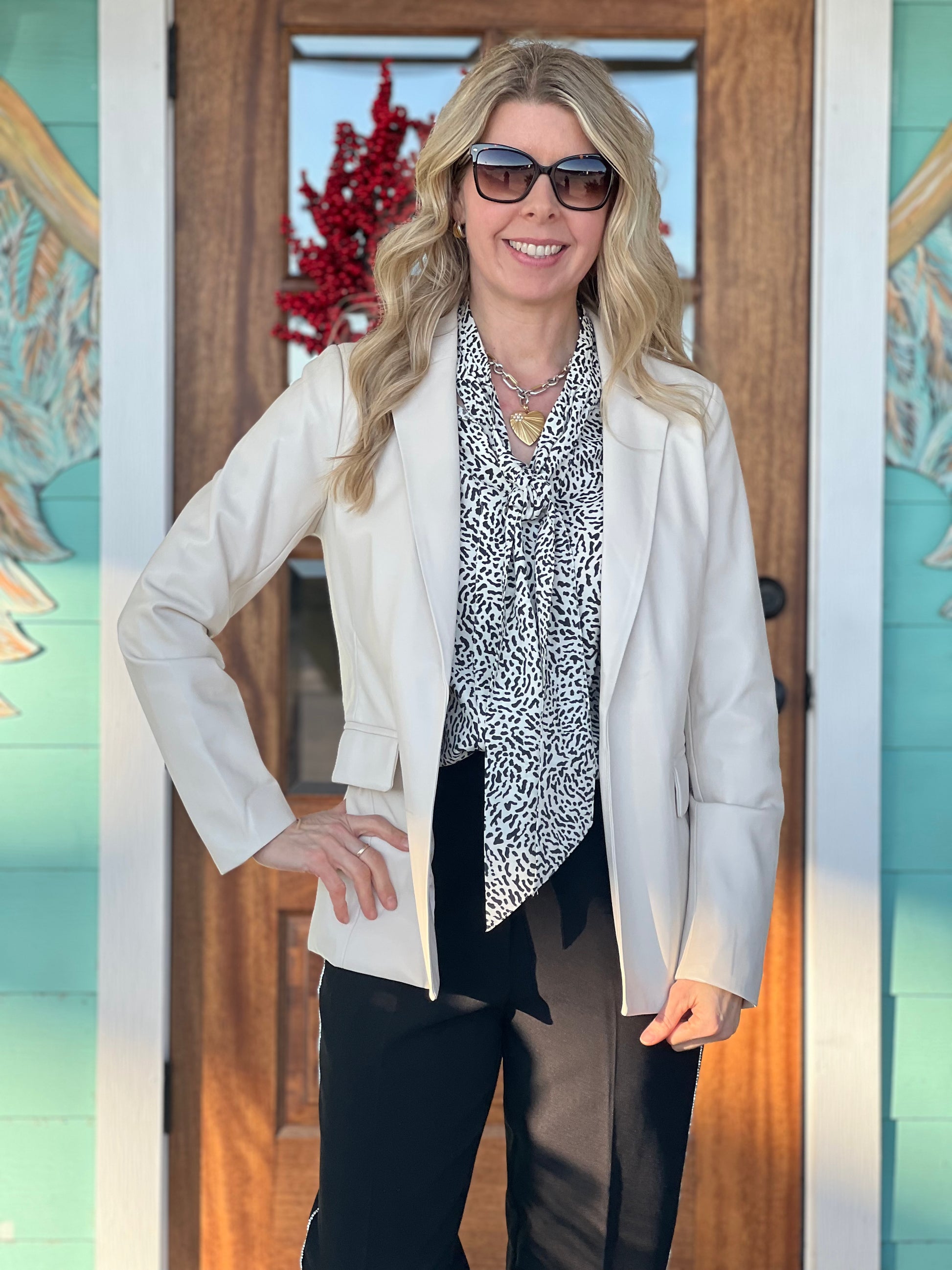 This long sleeve bow tie neck blouse features shoulder shirring and fluid drape with a smooth finish.