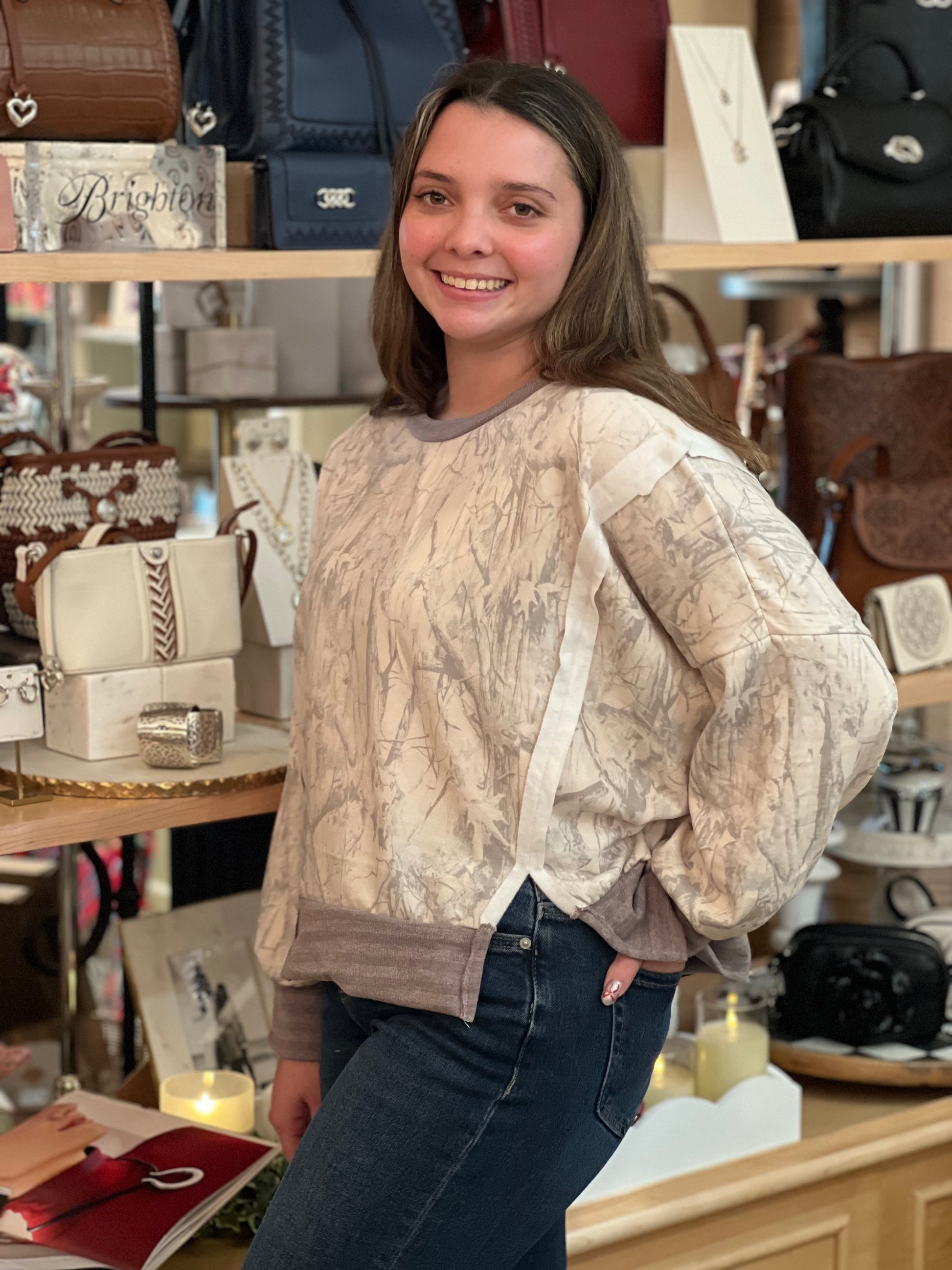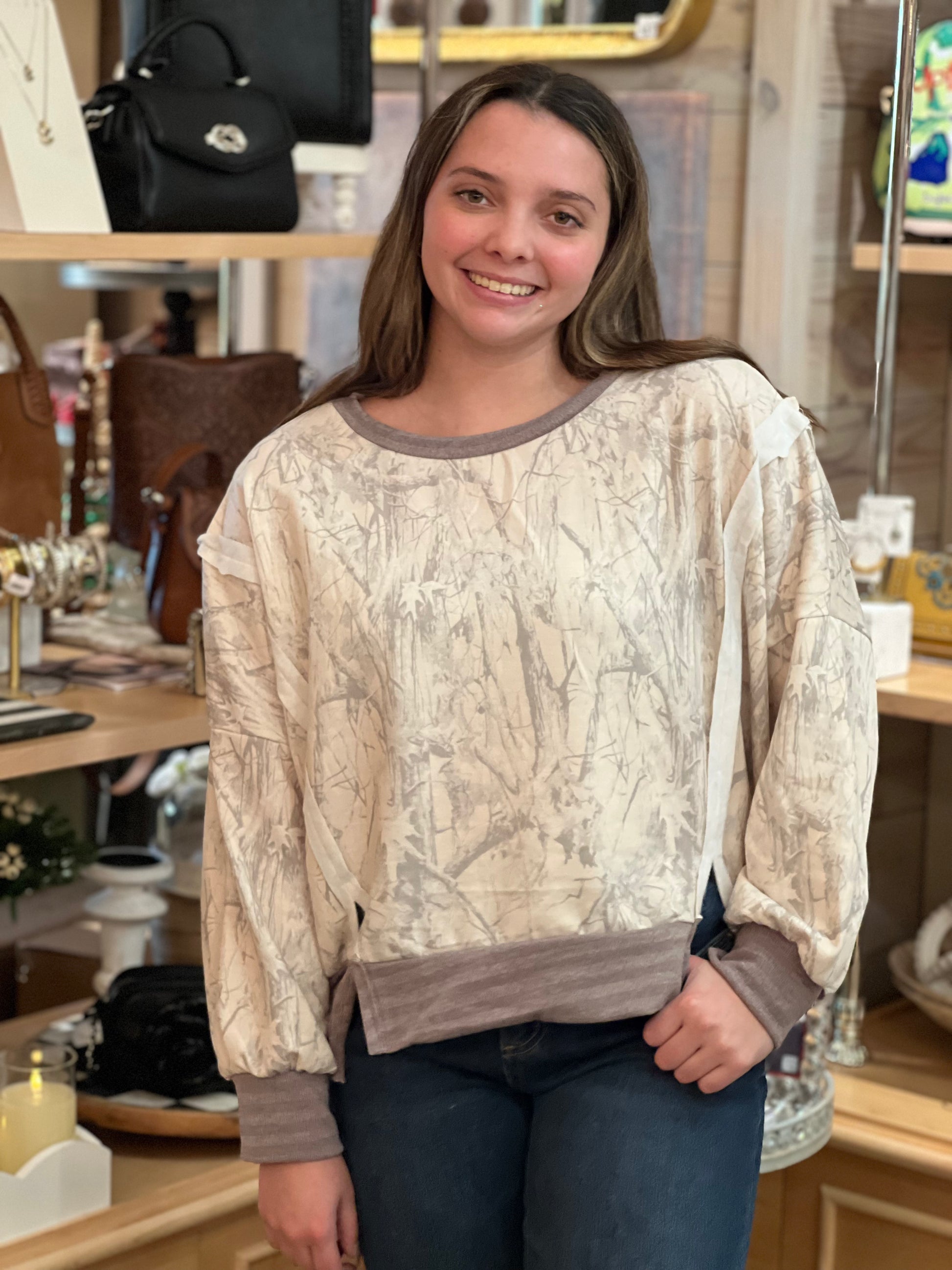 Easy, oversized, and a little outdoorsy. This soft camo top has raw edge details that give it a lived in look. The high low hem with side slits keeps it flattering and easy to front tuck if you want. Dropped shoulders and cozy long sleeves make it perfect for chill days and weekend errands.