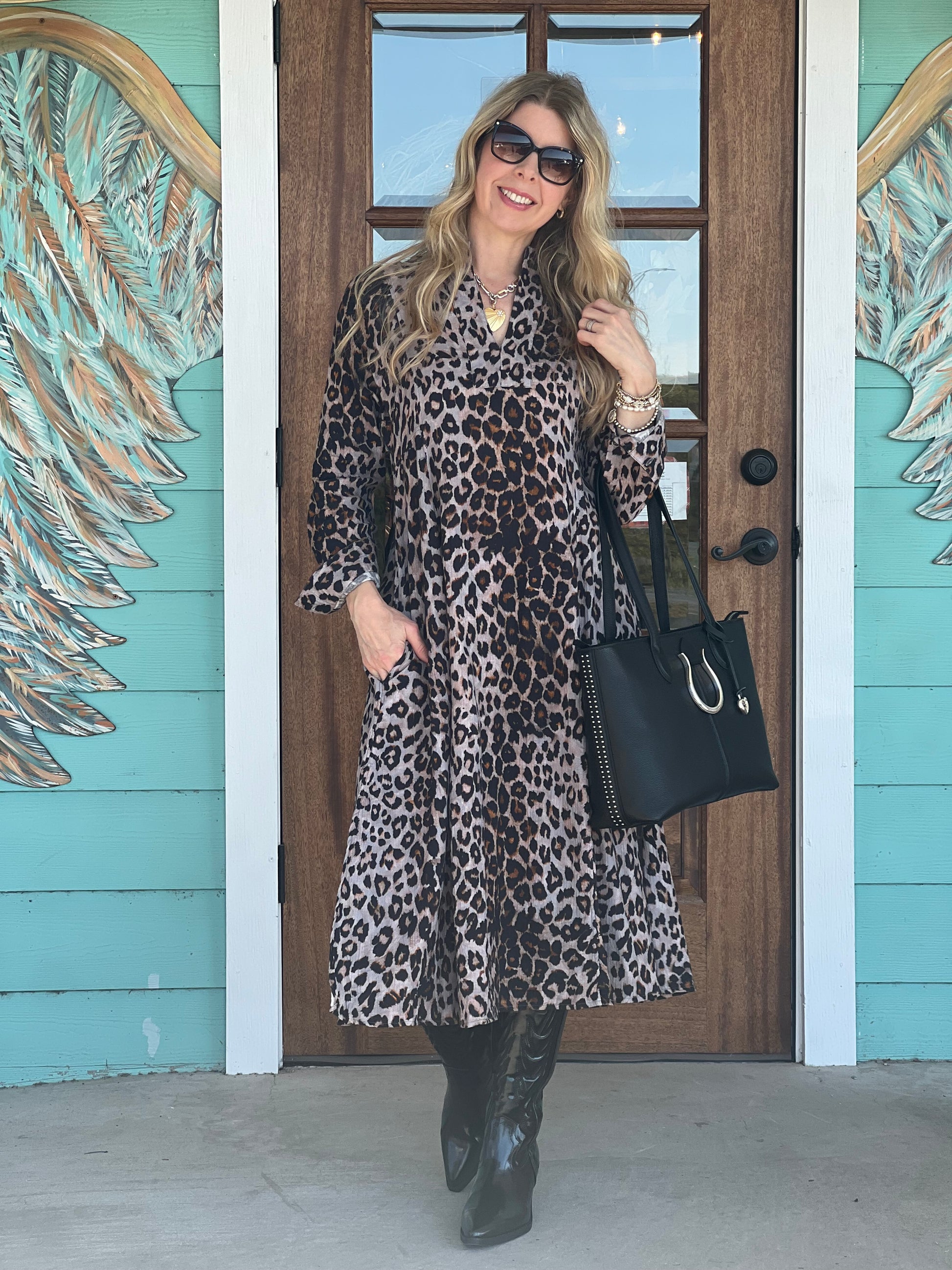 Uncle Frank’s leopard print midi dress features a split neckline with a mandarin collar and long sleeves finished with buttoned cuffs. It offers a flattering silhouette that gently flares toward the hem, complete with side vents and handy slash pockets.
