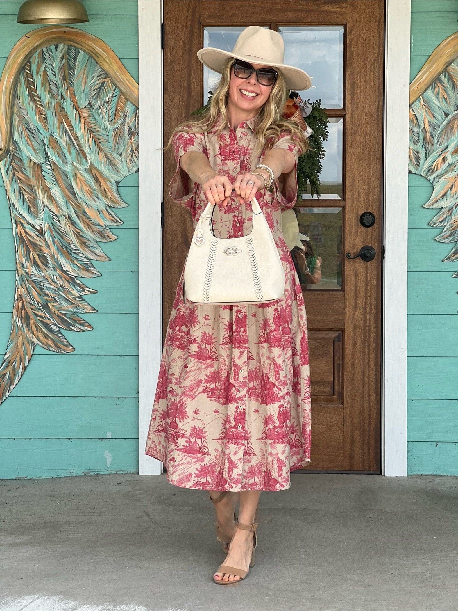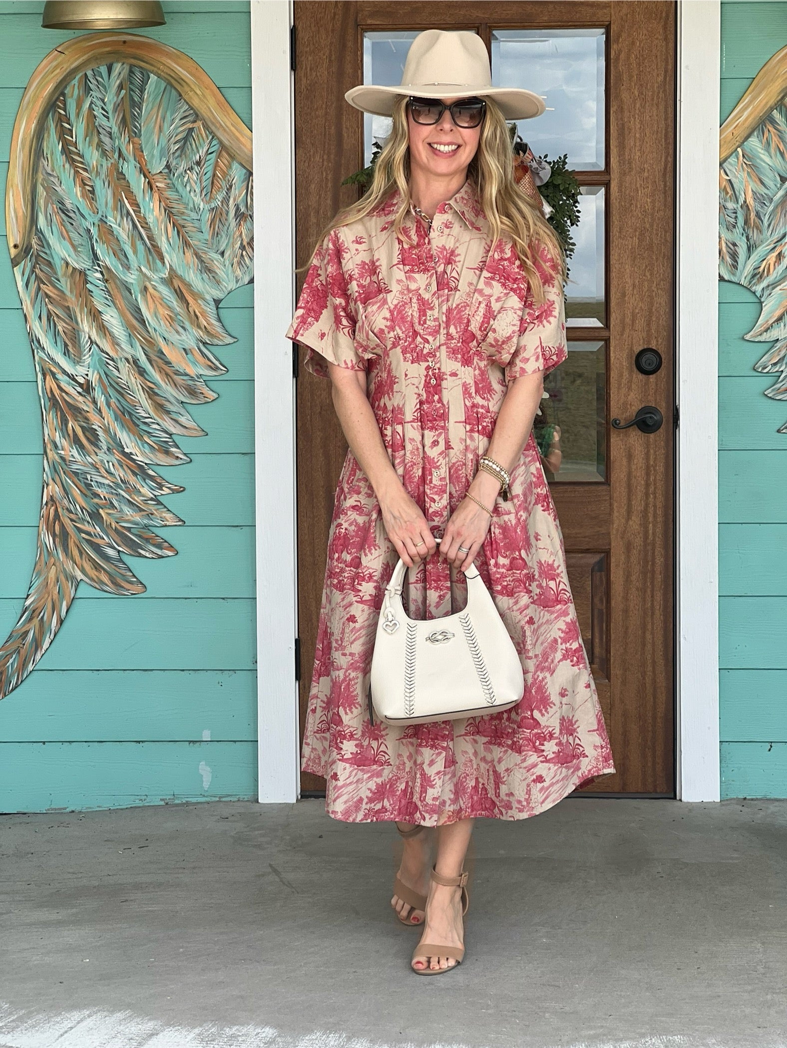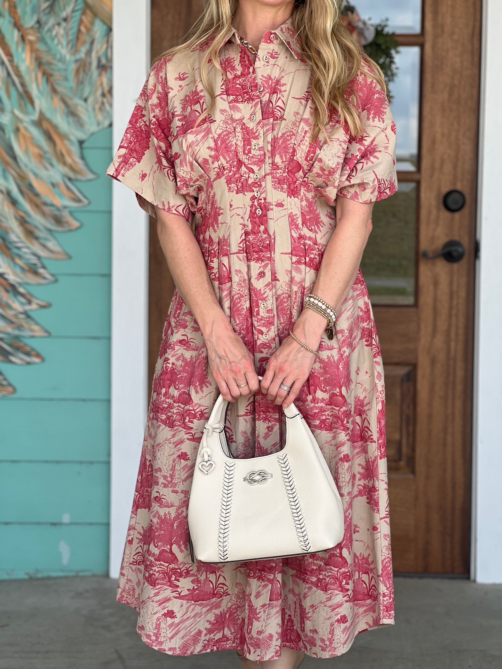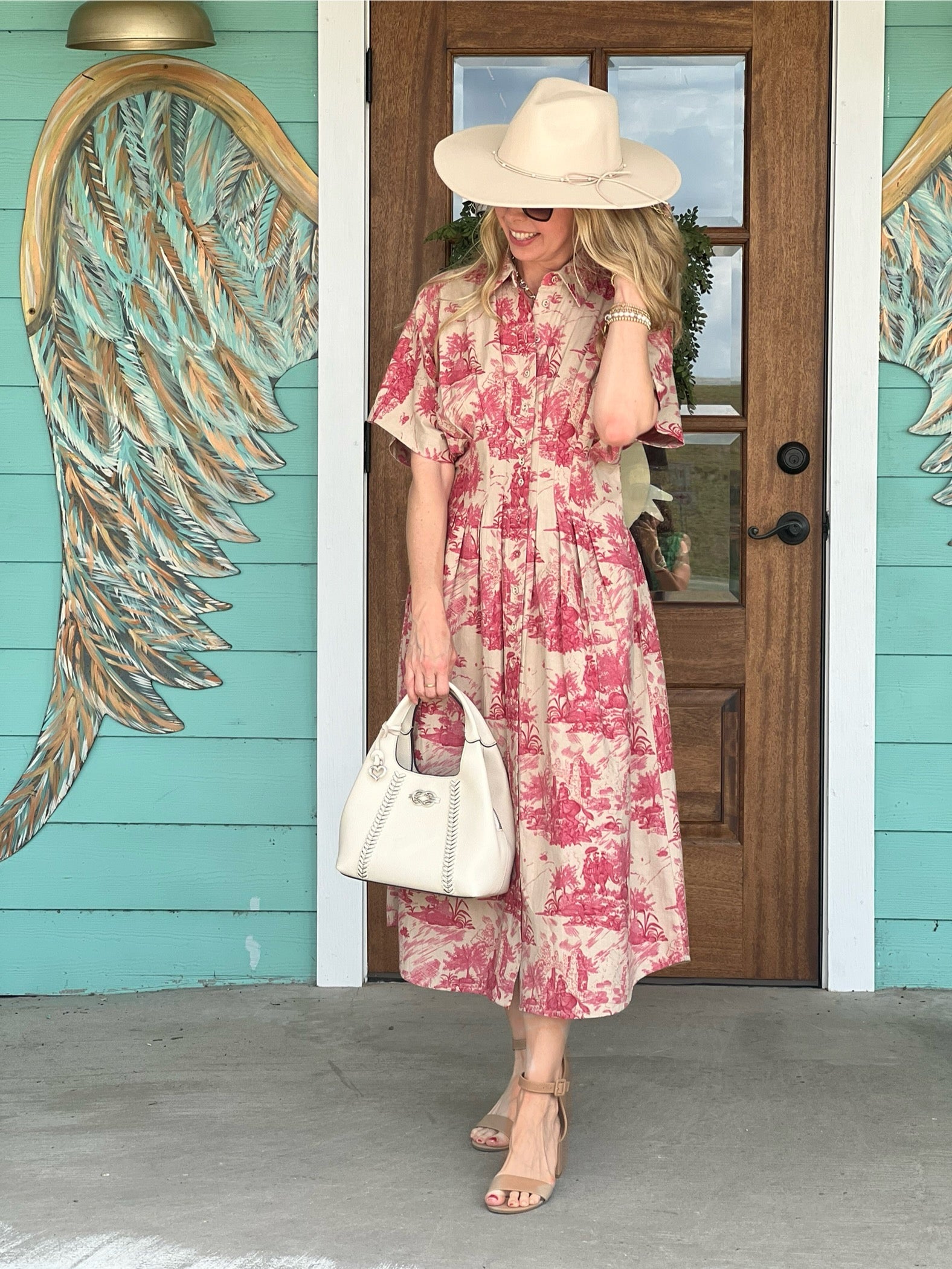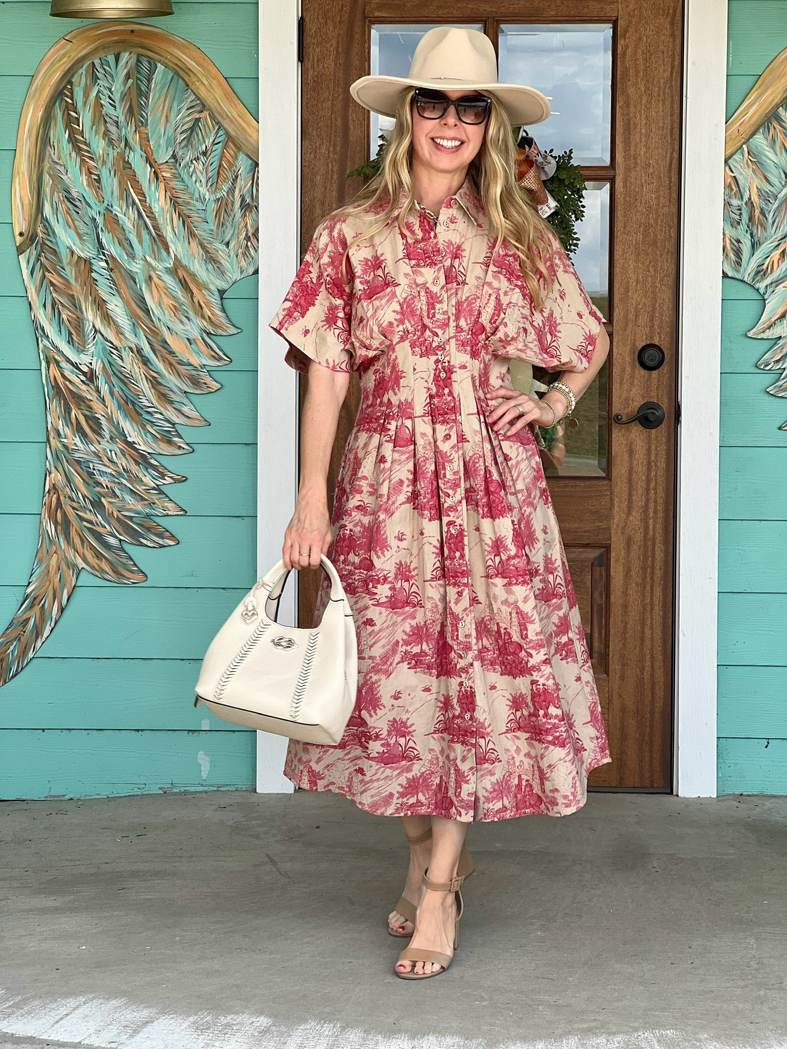 Slip into the Uncle Frank Pink Toile Midi Dress and enjoy a playful mix of comfort and style. Crafted from a soft cotton/flex blend, this dress features charming covered buttons down the front, a classic collar, and drop sleeves that add a fun twist.